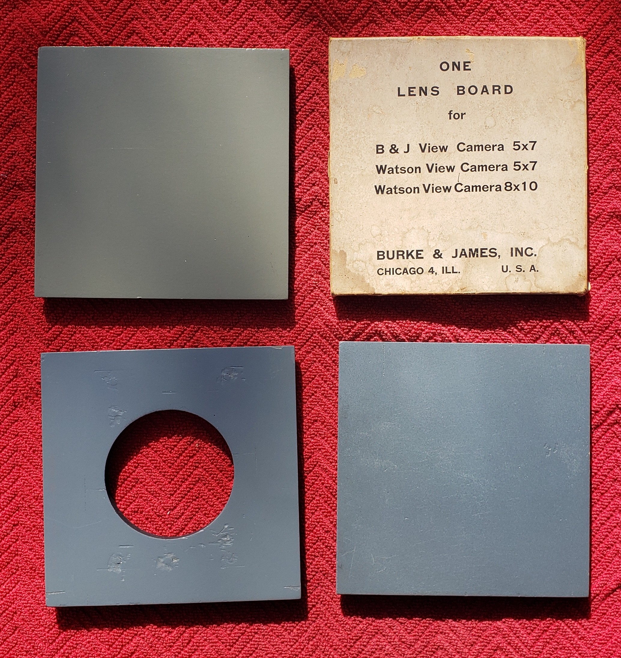 (3) Burke & James (B&J) 5x7 camera lens boards, 5.2" x 5.2"