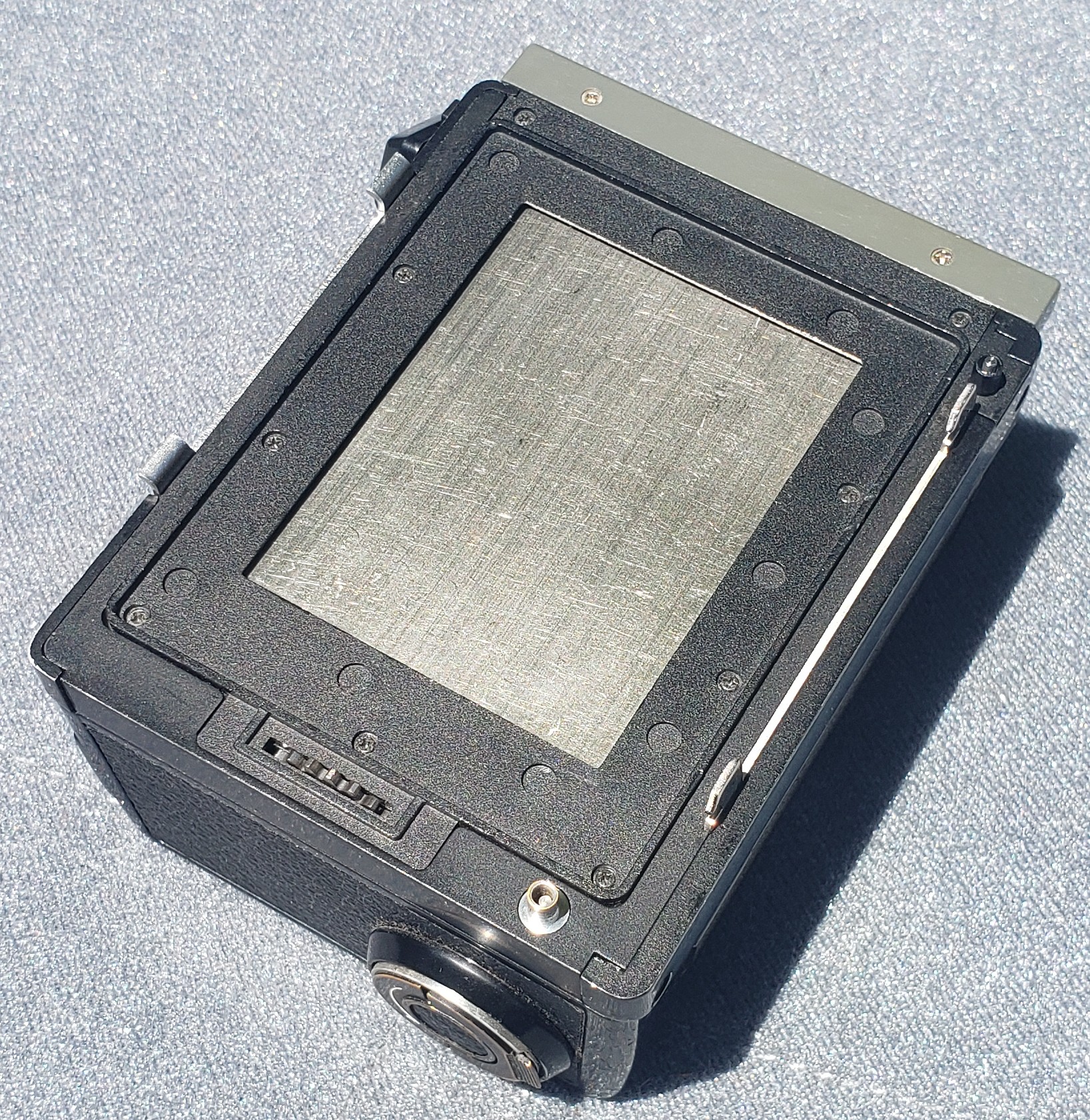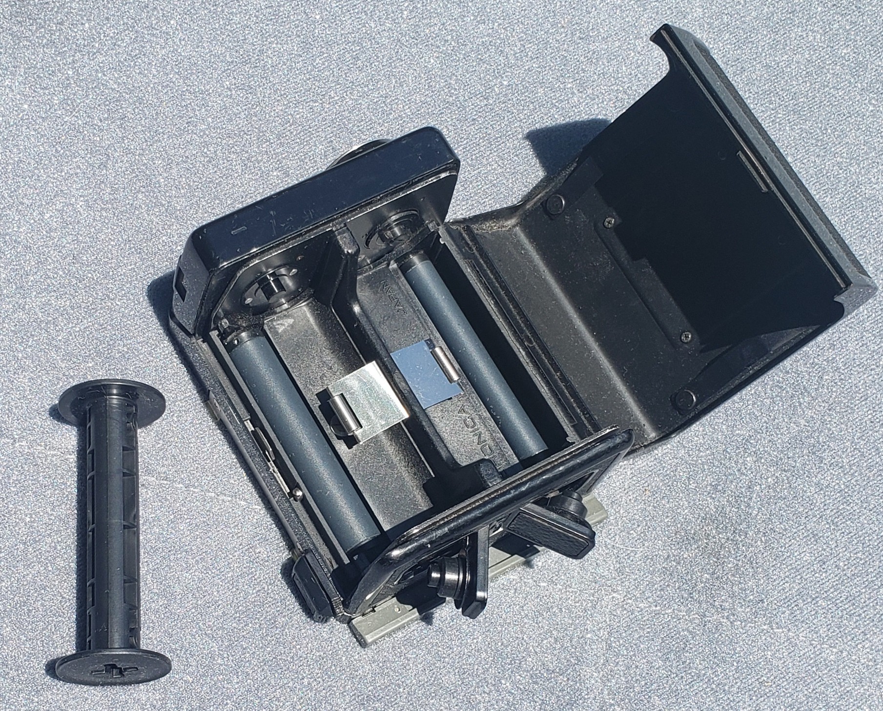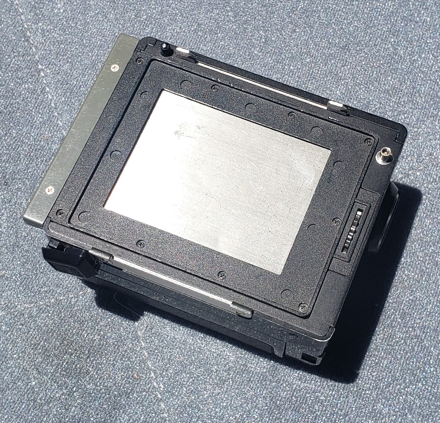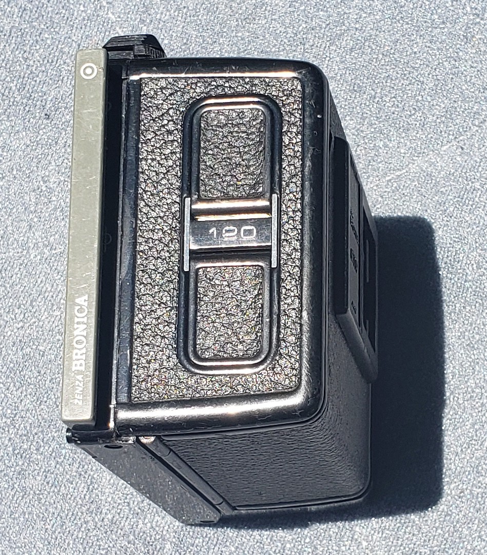 A nice, well-used 120 Film Back for a Bronica ETR, ETRS, etc. 645 SLR camera.