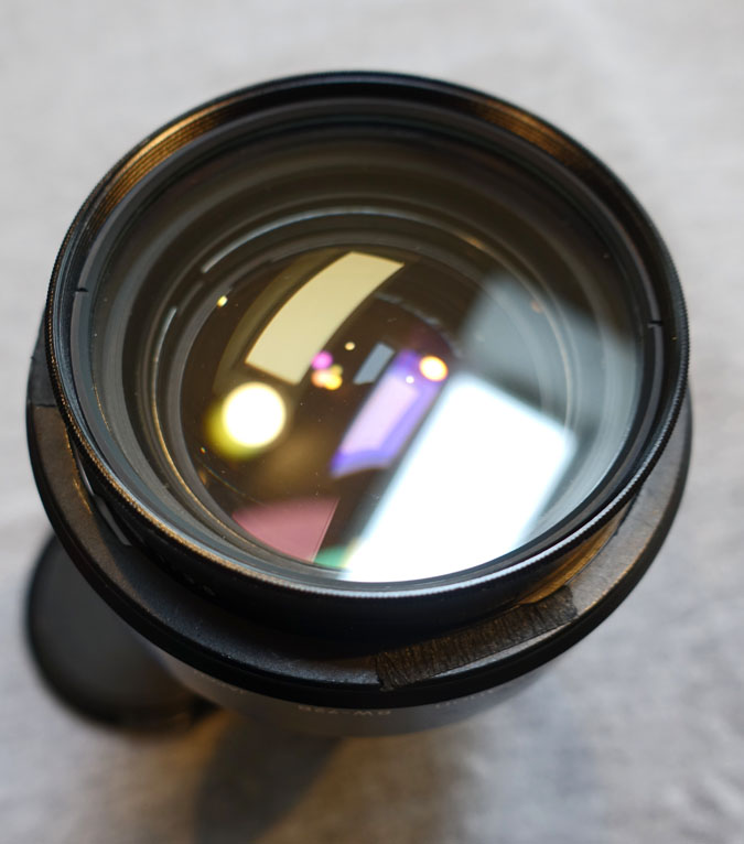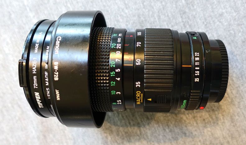 This lens in the Fdn mount, also called the new Fd mount or, a bit erroneously, the “bayonet” mount. It takes 72 mm filters and is a two touch lens with a macro setting. (It should not be confused with the f3.5-4.5 version which is a two-touch zoom, takes 58 mm filters, and is considered to be of lesser quality.)