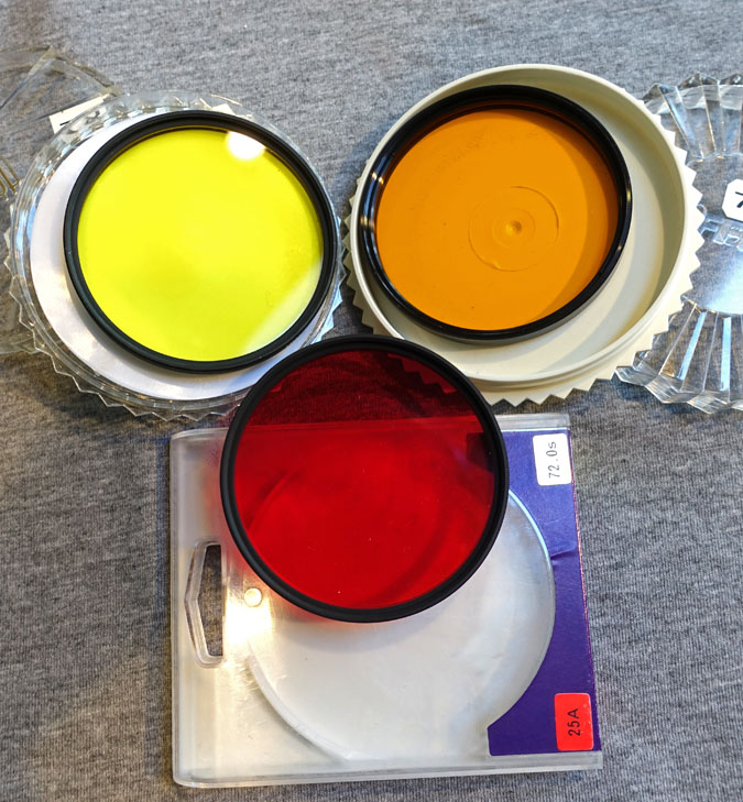 I also have three, 72 mm filters for sale. They are: Hoya yellow (Y K2), Hoya orange (O (G)), and Hoya red R (25A)). All are in excellent condition with no marks or scratches. They would be hard to tell from new. All are in cases, but the brand of case may not match that of the filter. I wish to sell these as a lot.