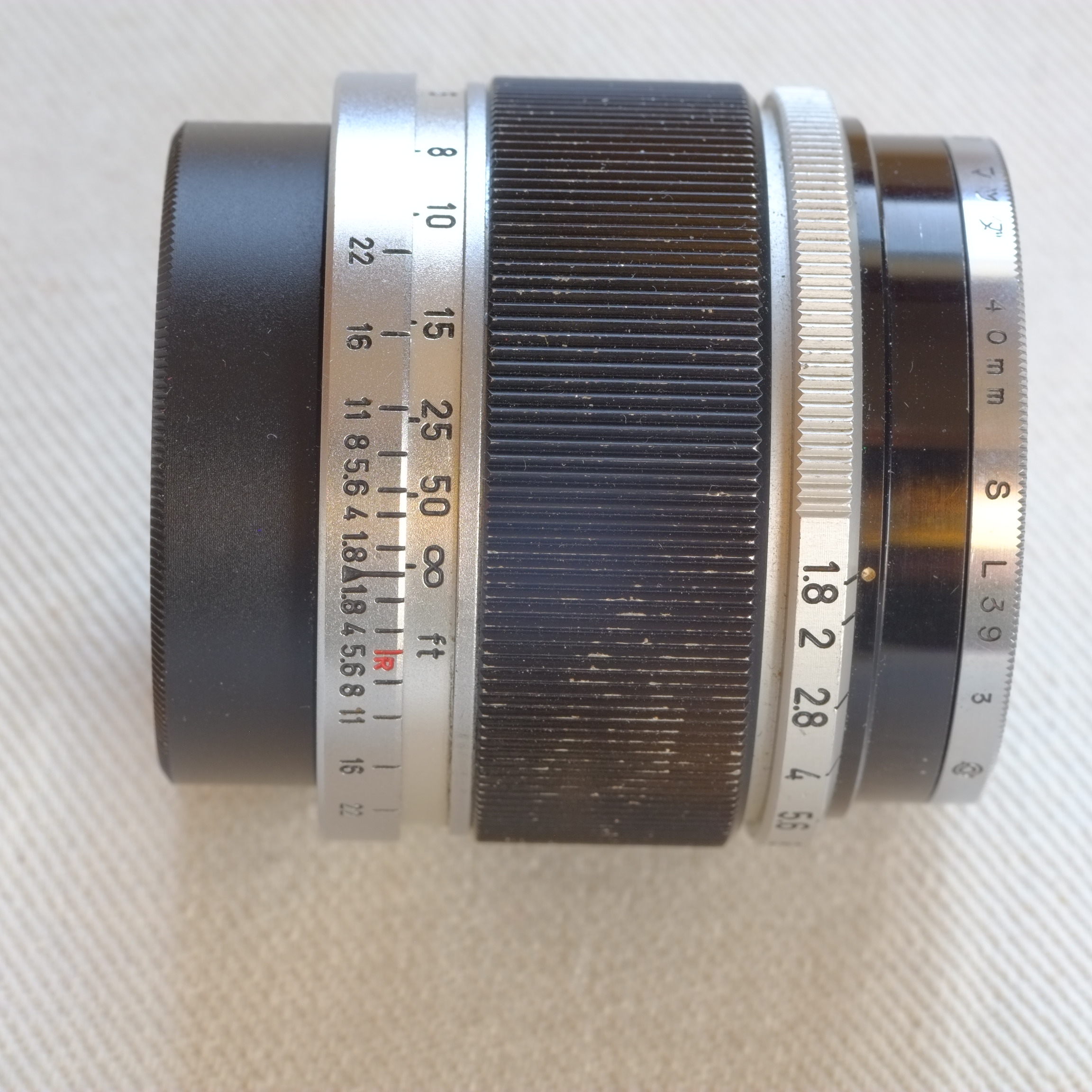 For Sale: SOLD. Canon 50mm ƒ/1.8 LTM lens, compact black and silver model, probably a Type III from the early 1960s (not the earlier heavy chrome body). This one is clean with no haze! When I bought it, it had some minor fungus, but Don Goldberg (DAG Camera) cleaned and checked it for me in 2022. The focus is smooth, and the coating looks intact. The black aluminum barrel has lost some color. 40mm filter size; one L39 slim filter included, Ser. VI adapter, and caps.