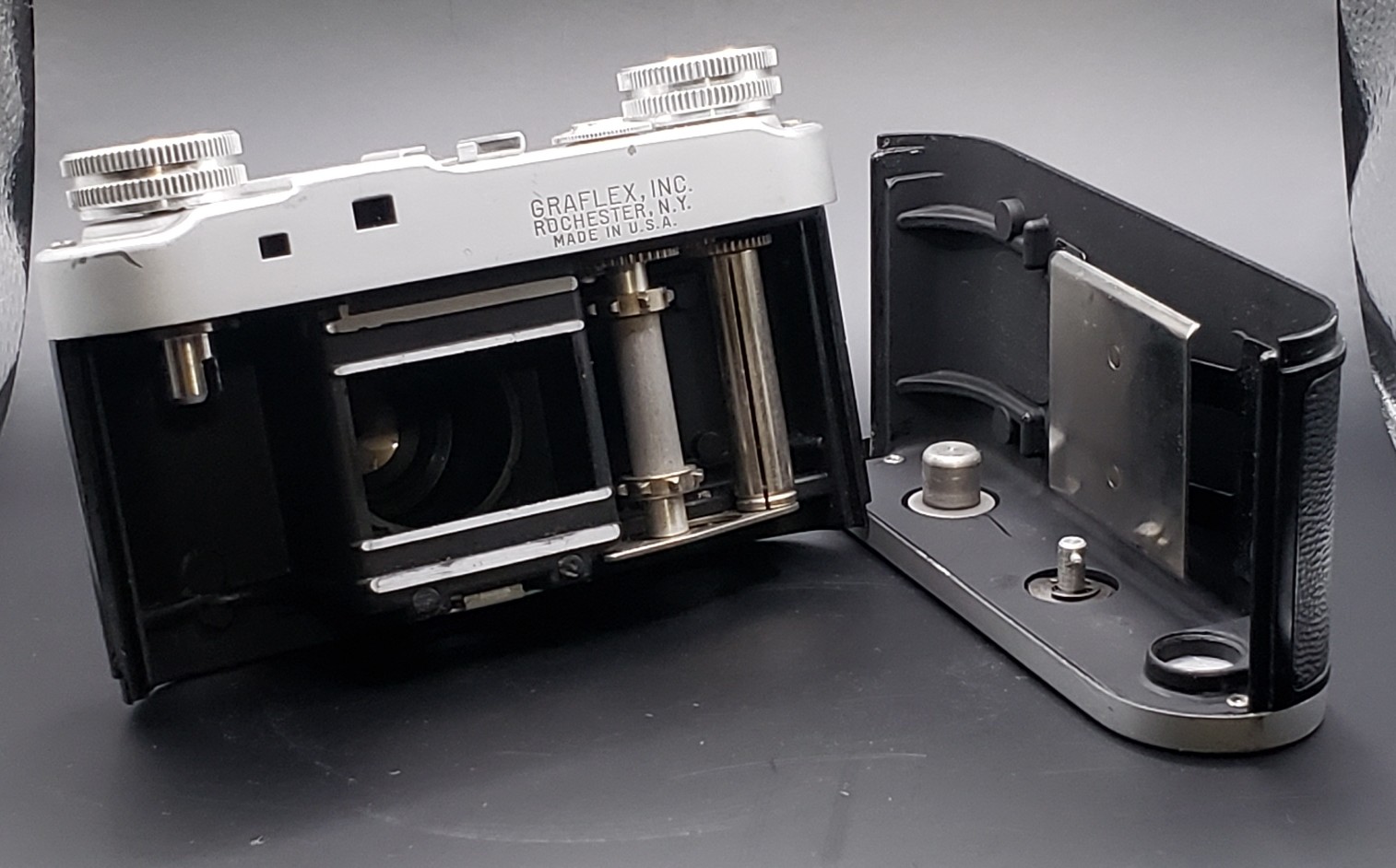 Made by Graflex, it's much smaller & cuter than the Argus C3, Kodak 35, etc. that it was competing against in the post-war MCM era.