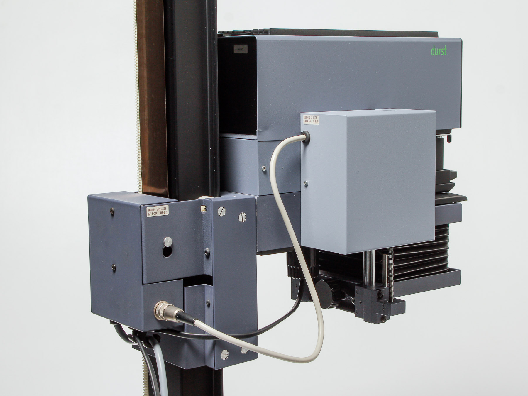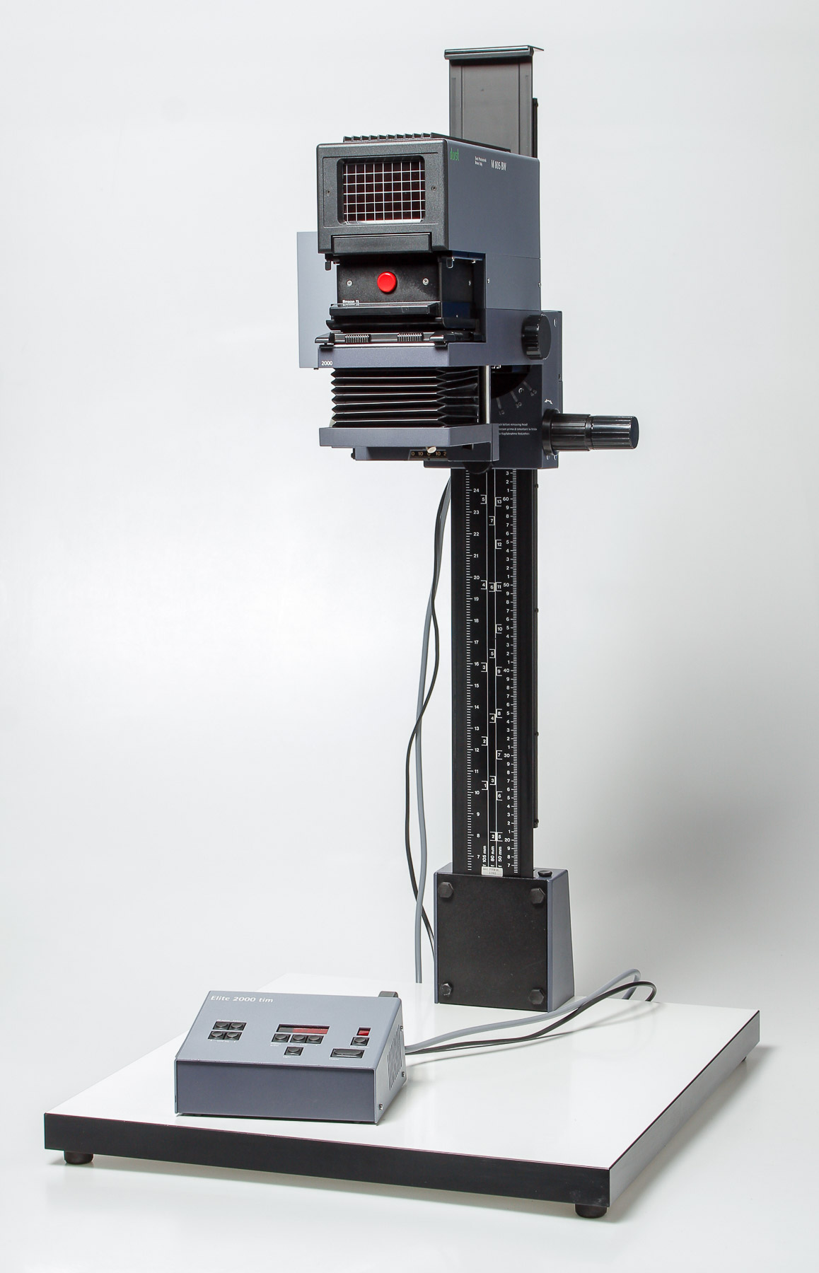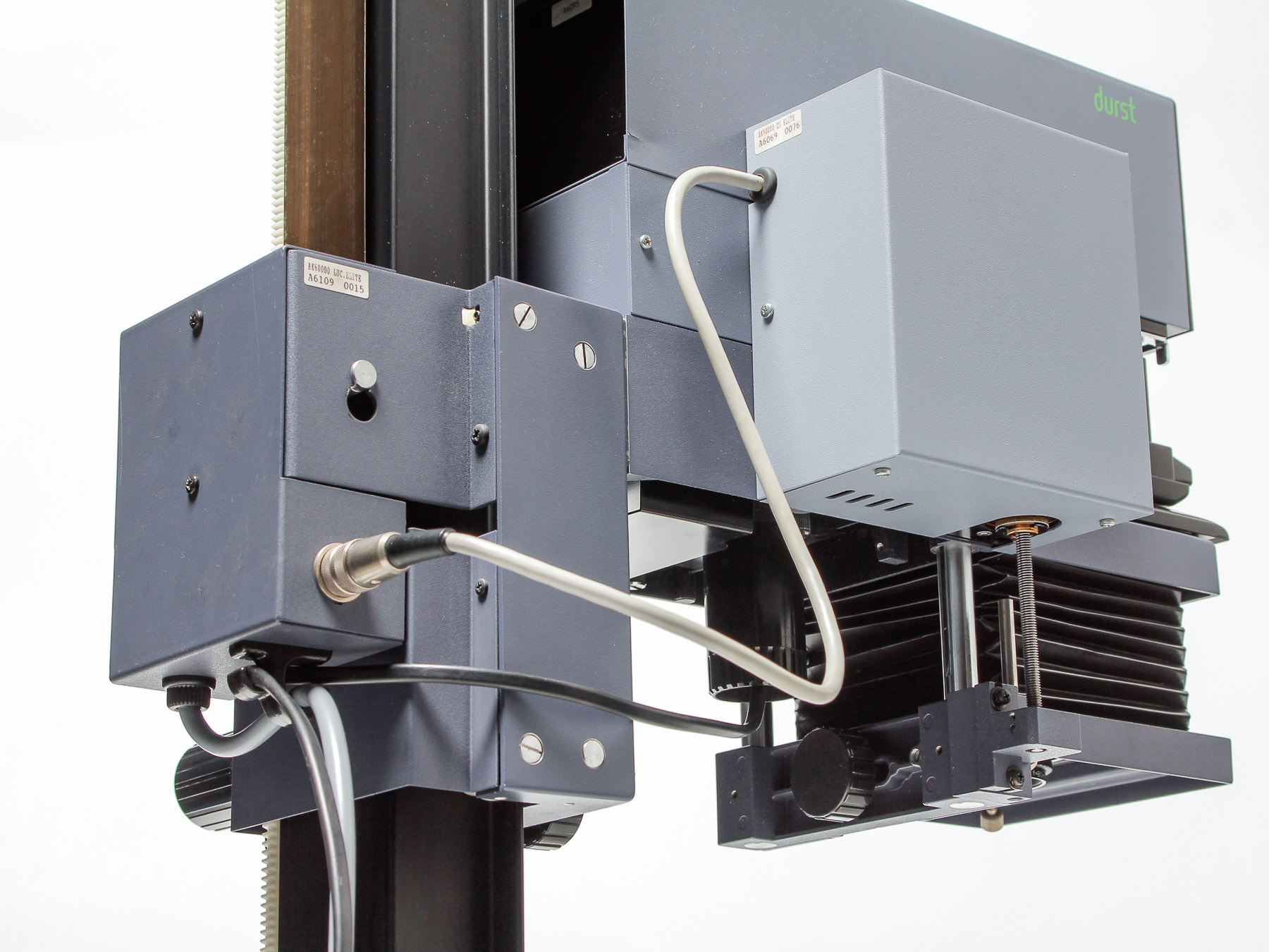 this is a Durst M805 with motrized Autofocus. It uses the same "Elite 2000 tim" Controller like the Laborator 1200. You can program and calibrate up to nine different lenses. The electronics and the mechanics are working flawlessly. Also you can do manual focusing via the correlating tabs.