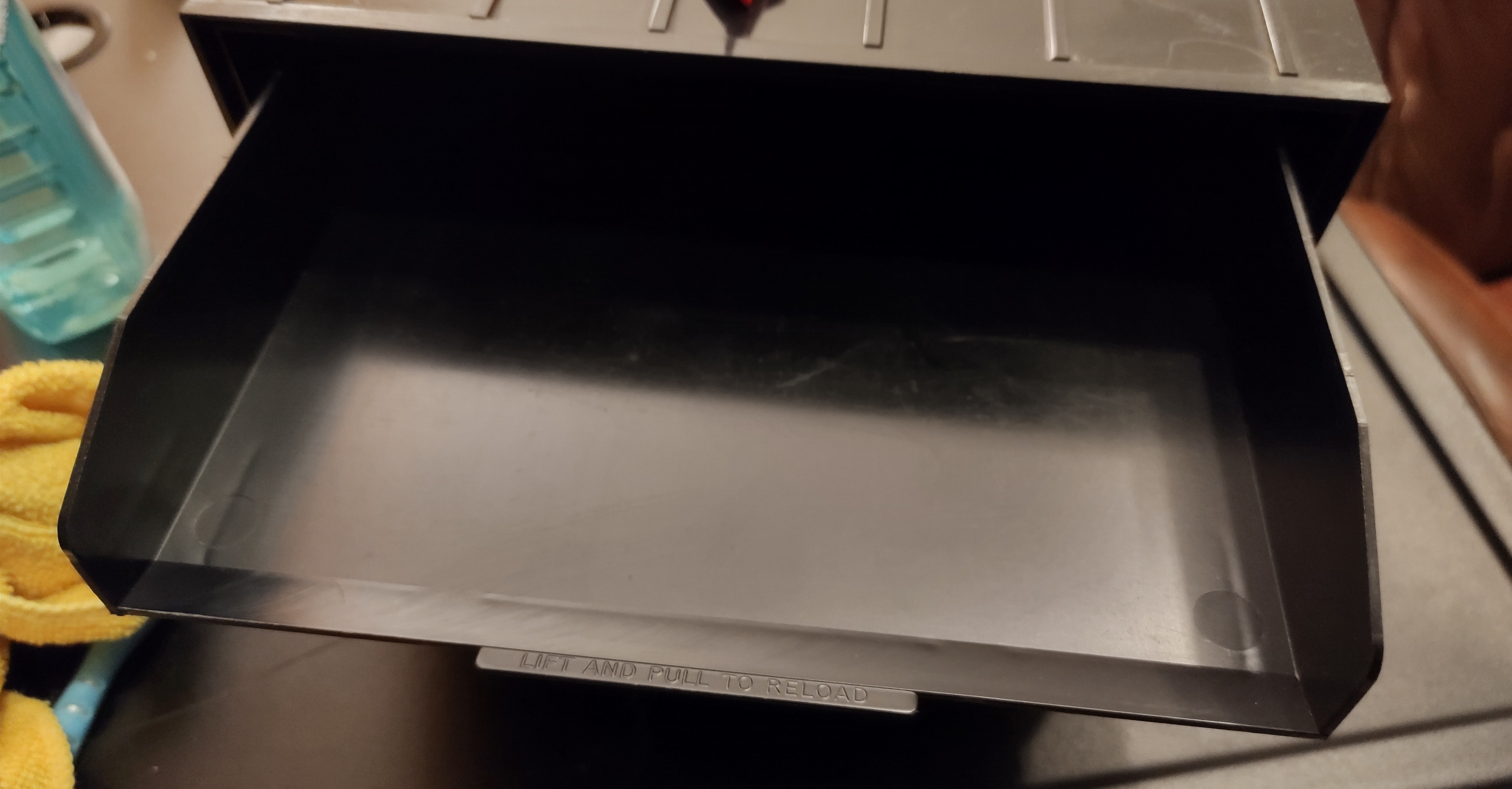No name, but looks just like the Kindermann paper safes I received in the same batch of equipment. No damage that I can see. Doors operate smoothly and spring close as expected. Internal drawers move in and out smoothly and lock in place. Paper ejects as expected.
