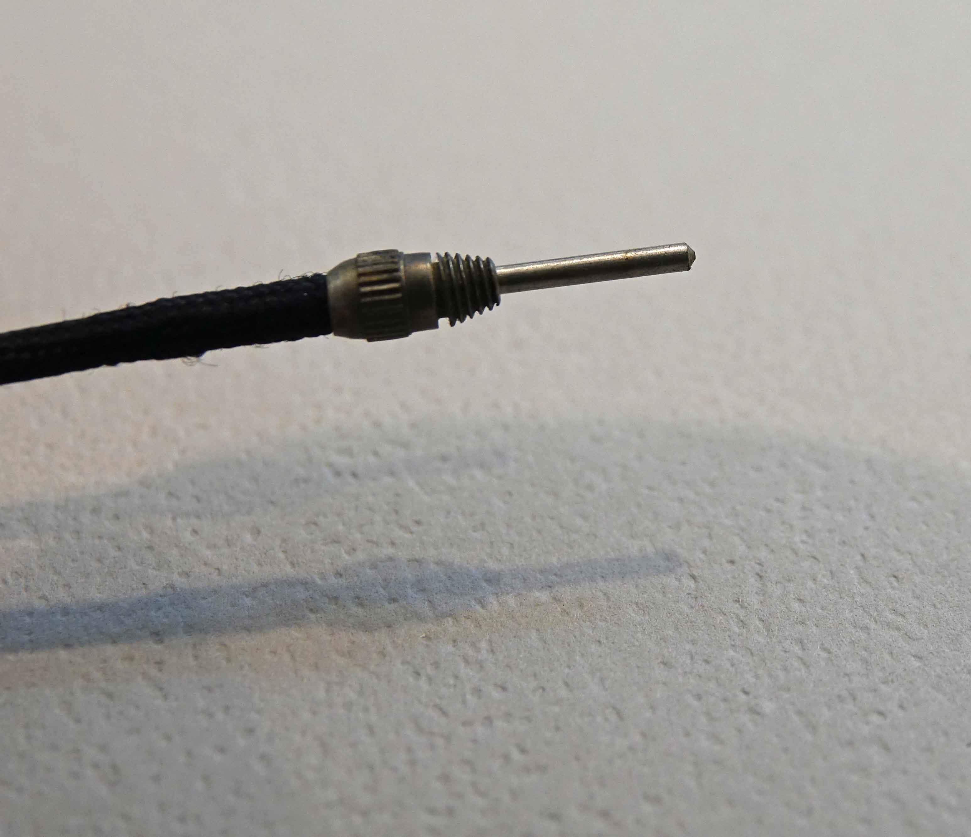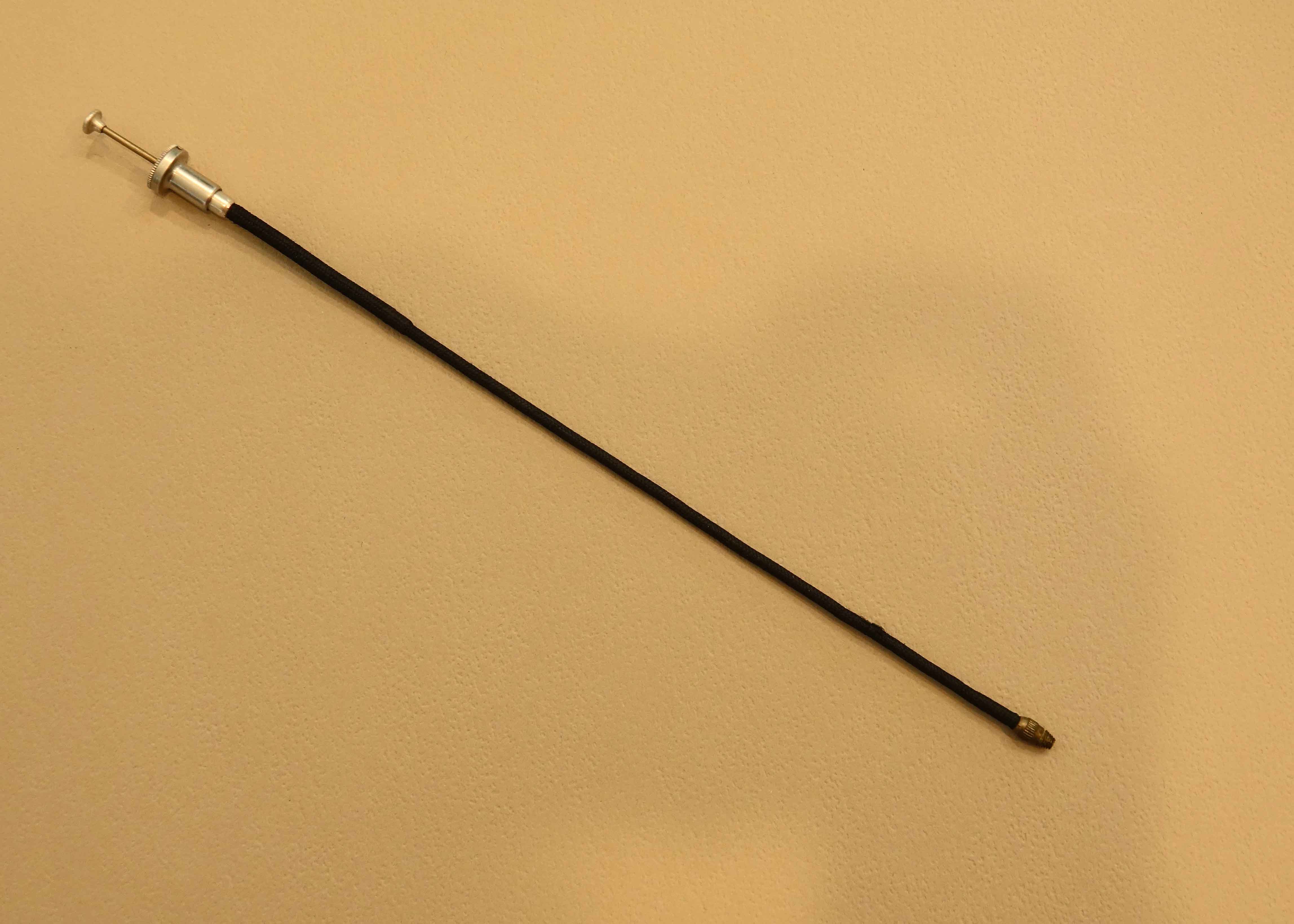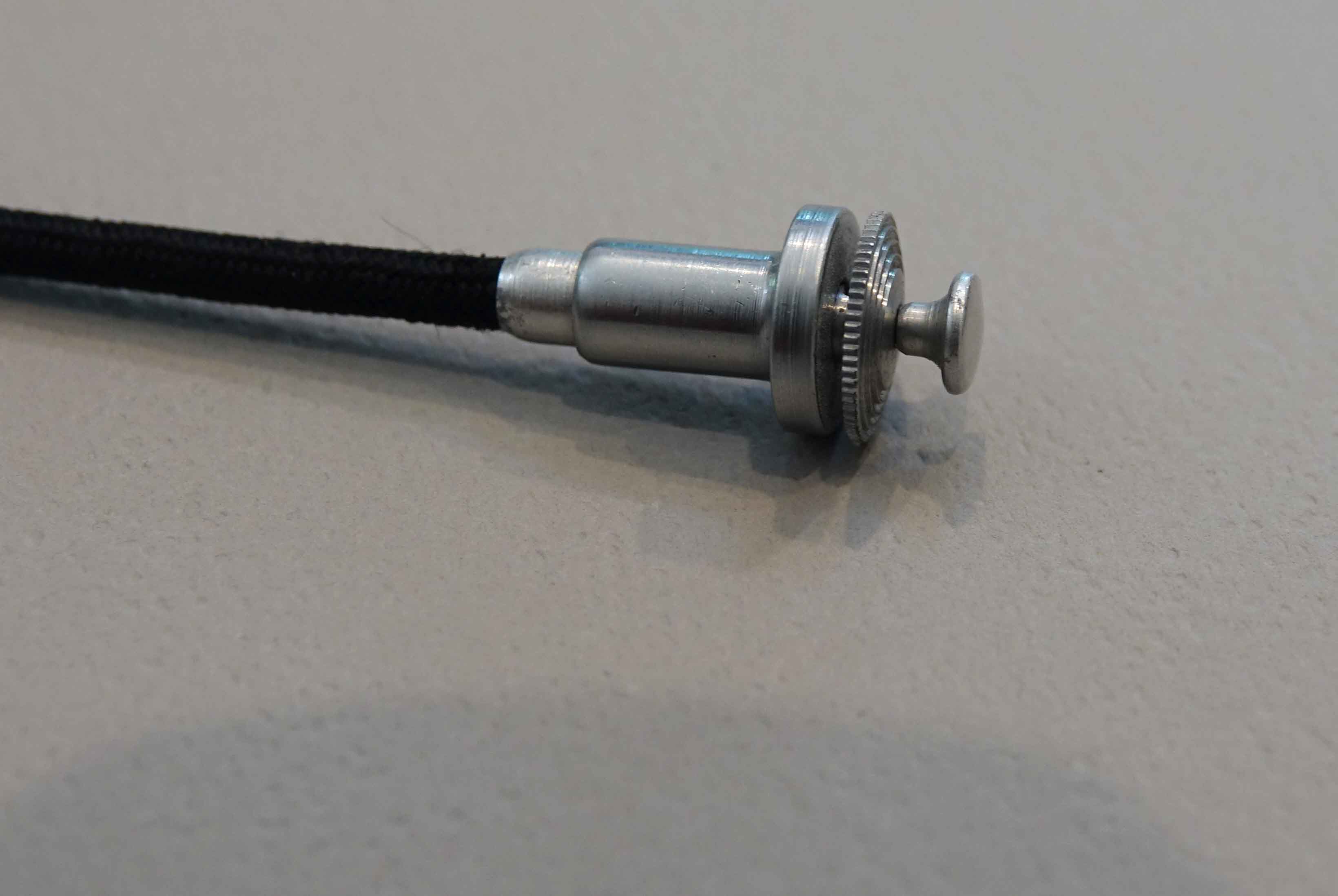 Two cable releases; approx. 9 1/2 “and 20” o/all. Both work perfectly and the smaller one can be locked extended for “B” (bulb) exposures. As seen in the photos of the shorter unit, there is a small disc at the actuation end. Turning this disc CCW about 1/8 turn allows it to move up a small amount thus allowing the plunger to stay extended. Turning the disc back to the “closed” or “down” results in normal operation.​