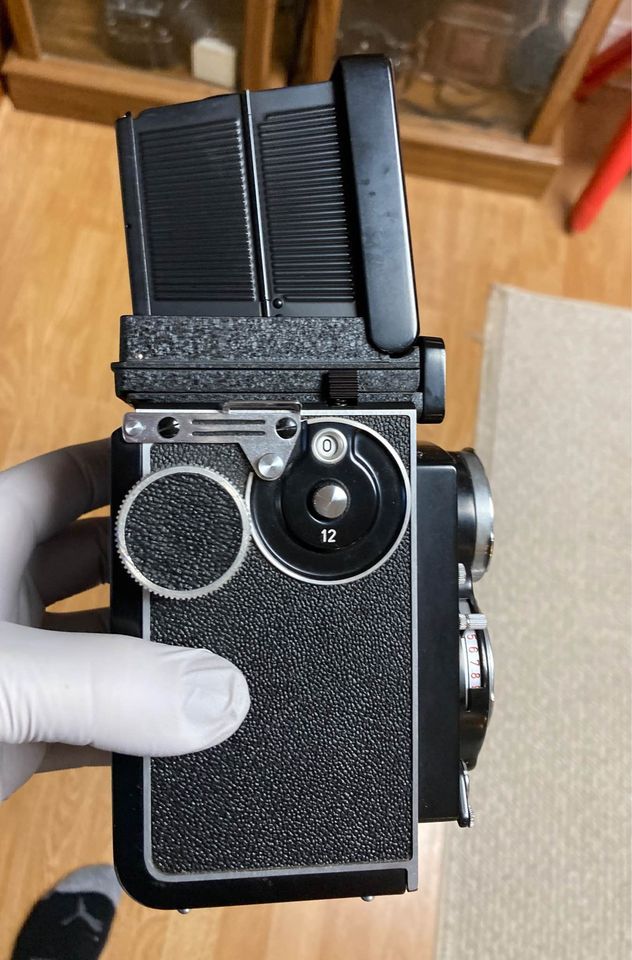 1968 Rolleicord Vb Camera in good working condition. Cosmetically, the camera is very nice. Operationally, the shutter works at all speeds, one second is a bit long but still ok. Self timer works! Hood and magnifier in good shape. Focusing is easy. Lens is clear and has no fungus or haze, but there is some light coating wear. While it appears like haze, its actually coating loss - see picture with red circled area. There are a few stray cleaning marks - nothing bad. No oil on blades. Lens still shoots great since all the glass is coated. So camera grades a 9- and glass grades a good 8. $ 259 plus shipping. I ship worldwide to PayPal addresses from Boston