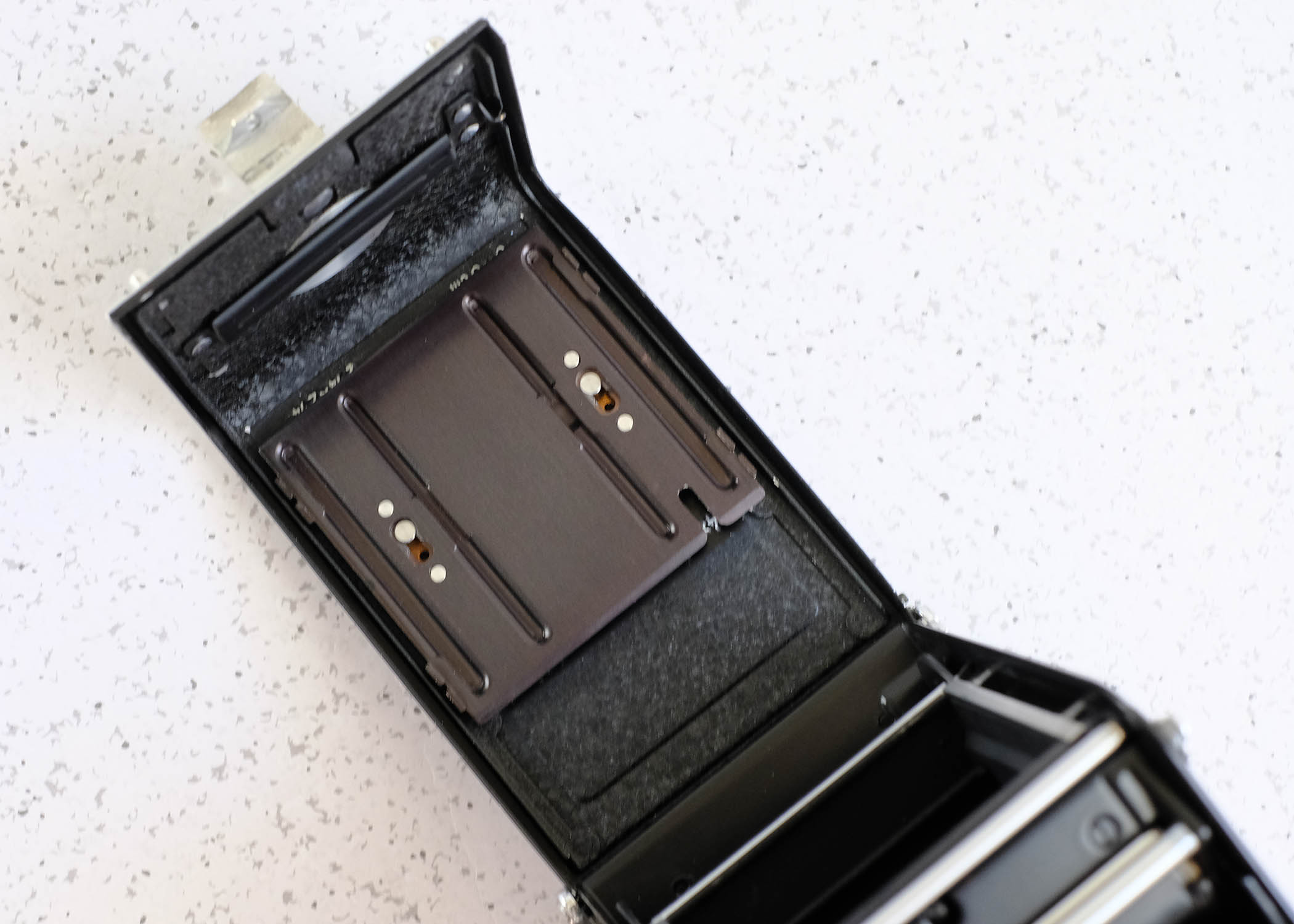 Strap hangers have been replaced with factory original 2.8f ones that accept an alligator clip shoulder strap; the original hangers with screws are included as is the correct instruction manual, original focusing screen and great condition mirror lens cap. You will notice an old sticker on rear door - I left this because it's part of the camera's history, it’s in Arabic! The only operating issue is the self timer does not seem to set properly, but this is a non-issue for me. Only reason I’m selling is I’ve settled on the Mamiya 7 system, so this camera is now redundant.