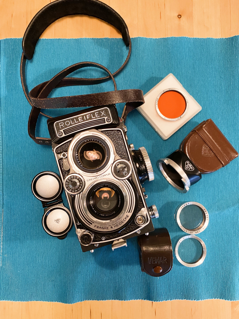 Camera comes with an original hood (with case), and original orange filter, an aftermarket “rolleinar 1” (brand Vemar, which works great and produces very nice sharp images) plus case, a soft release for the shutter button, lens cap, and a new Rollei leather strap.