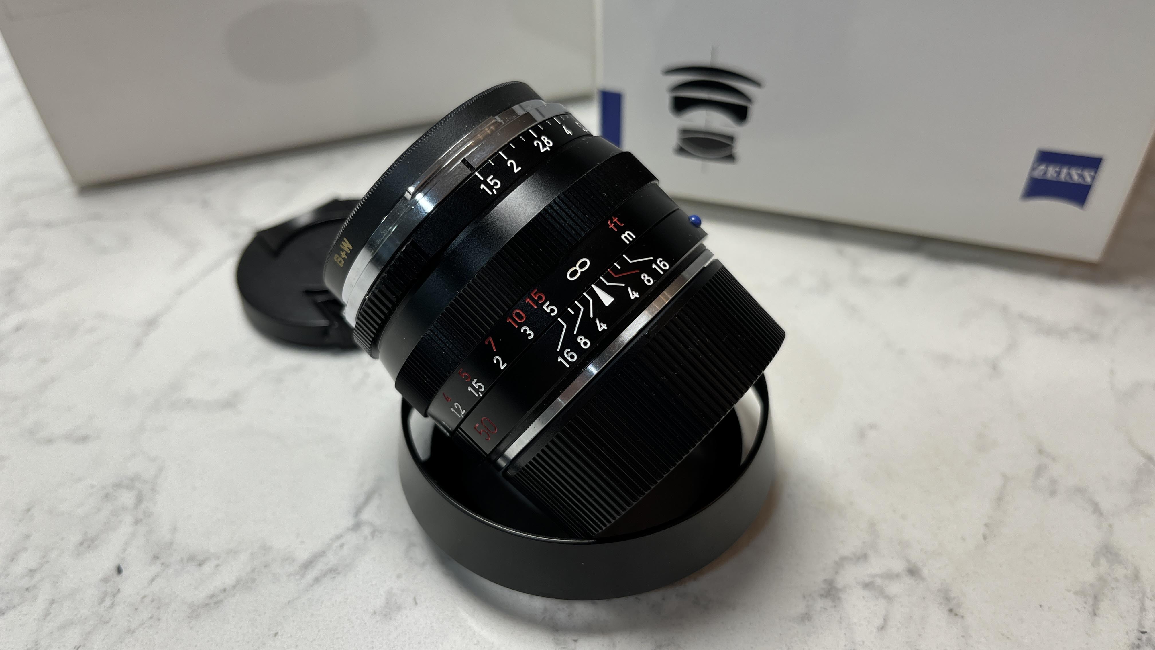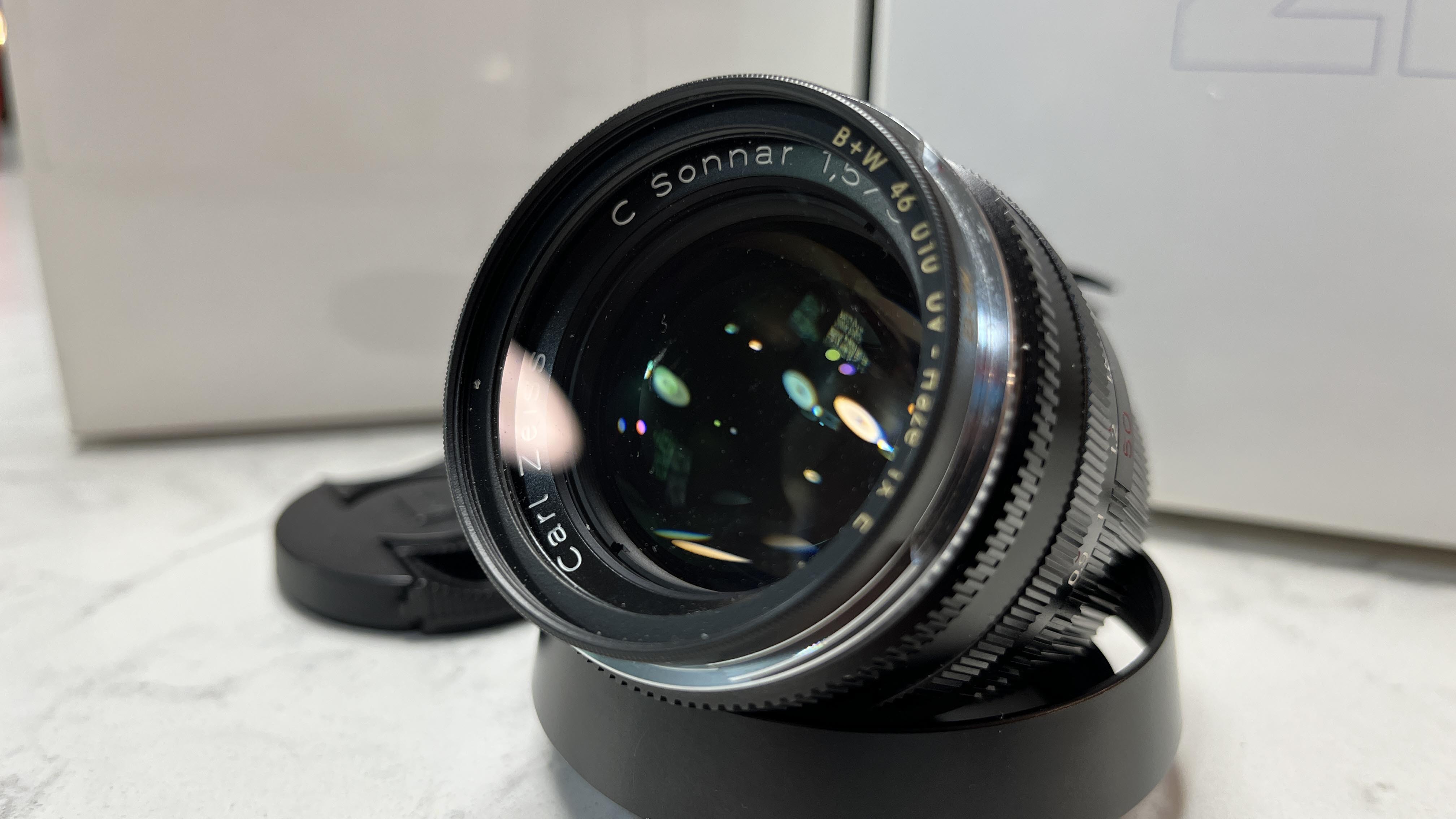Letting go of another of my M-mount lenses in an effort to 'less is more' my photography gear (y'all know I'm gonna just go buy more gear though). Anyway... This is a really good condition Zeiss Sonnar 50mm f/1.5 in black with the OEM hood, caps, a B+W filter and the original boxes for both the lens and the hood (oddly, the hood box is much larger than the lens box). I probably have the original box for the filter as well, but I'll have to dig for it so no promises. Overall condition is excellent. I've owned this lens for about a year and it has produced excellent results on my M6. The aperture clicks appropriately and the focus is nicely damped and very smooth.