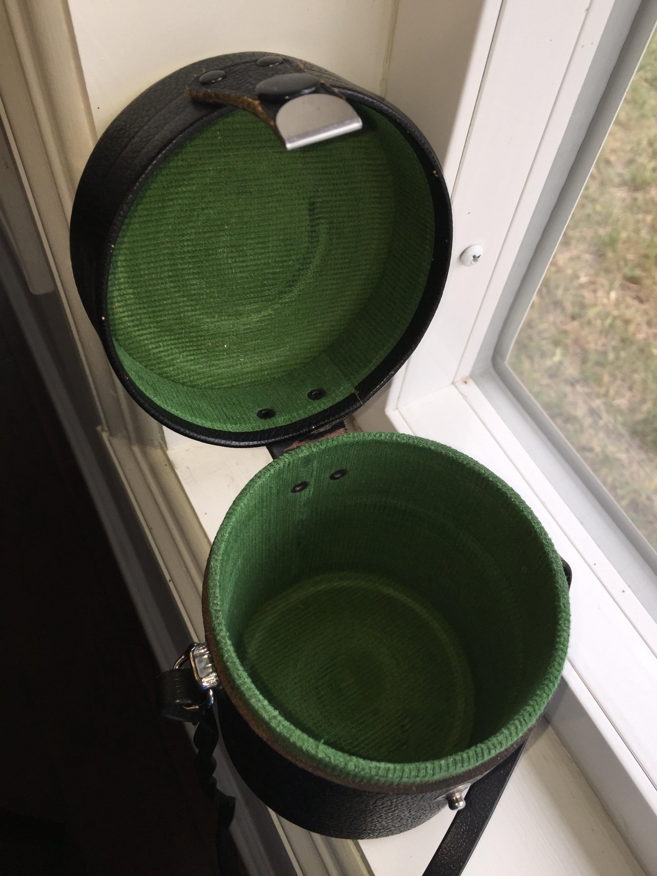 Sold as shown with original leather case, original front metal cap, and Canon-made rear cap