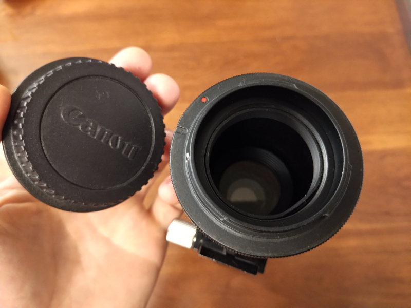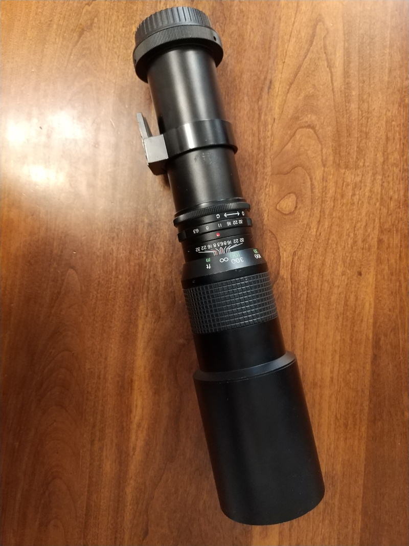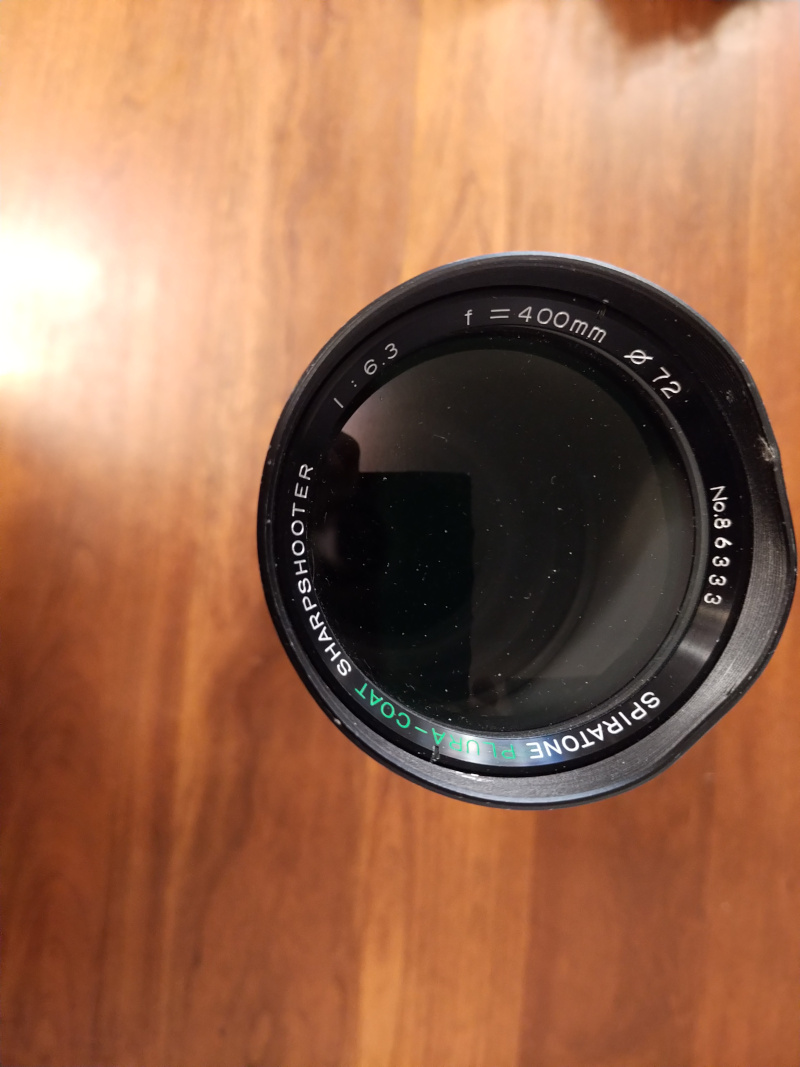 Spiratone plura-coat sharpshooter 400mm f/6.3 lens. The lens is T-mount, but comes with a Canon EF mount adaptor. Front housing is dented so it would probably be hard or impossible to get a filter attached.