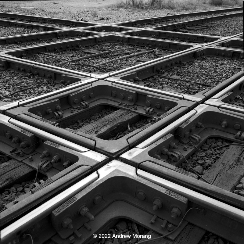 Another example of where square works. This is a rail crossing at a spot called Tower 26 in northeast Houston (Texas). There is no tower any more, but the name remains. It seems to be a popular place for railroad photographers and has access on a public road. Hasselblad 501CM, 50mm ƒ/4 Distagon lens, Panatomic-X film, tripod-mounted.