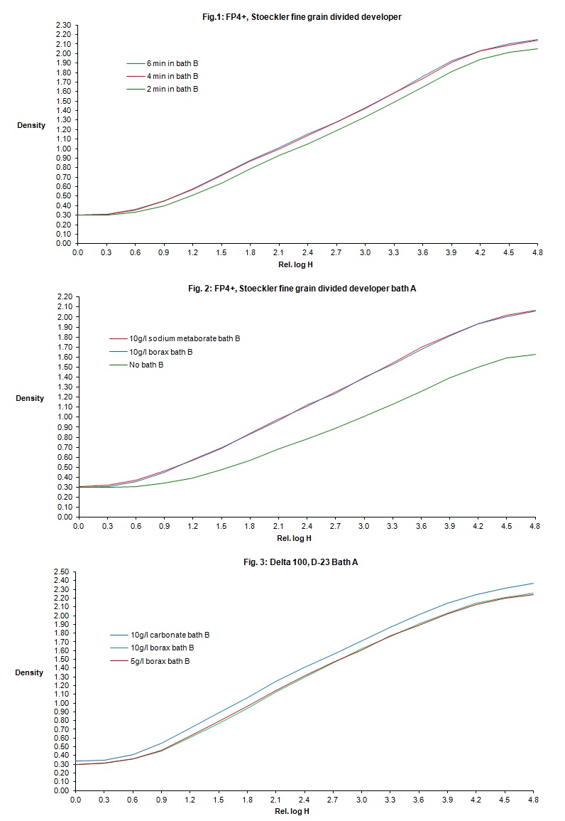 Regarding two-solution/divided development, below are some curves. Some of it is for Stoeckler's two-bath (which was one of the first of these) but the D-23 version(s) including Thornton are only trivially different. Some general results: