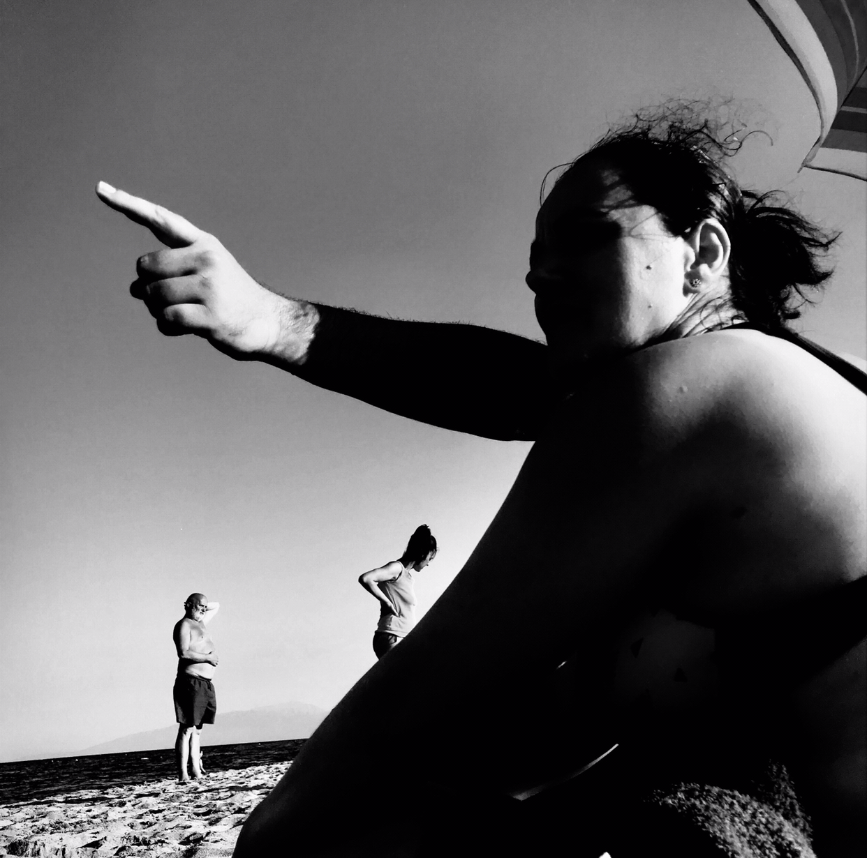 The pointing figure gives movement to the whole, to even the semi-static figures - the woman completes her glance down and small kick at the sand and the old gent anoints his belly and pate with swirls of propitiation and prayer and they are animate, and the animation invites or compels narrative because there is a story being told, but the viewer must complete the details for himself. Looking at this rich photo demands, compels participation. And that is one foot print, the spoor of art.