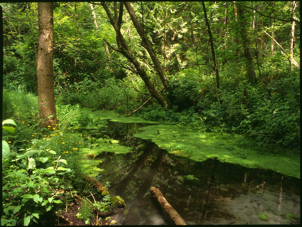 The picture is intentionally of a scene with relatively neutral/predictable colors on an overcast day, straight out of DSLR digitization with white balance matching the backlight... slide that is heavily expired tends to have a strong reddish or purple tint. This can be easily corrected (unless it's really extreme), but this 2018-expired roll of Velvia 100 did not need correction. The image has a slightly cool tone because overcast weather has that color temperature and Velvia amplifies colors.