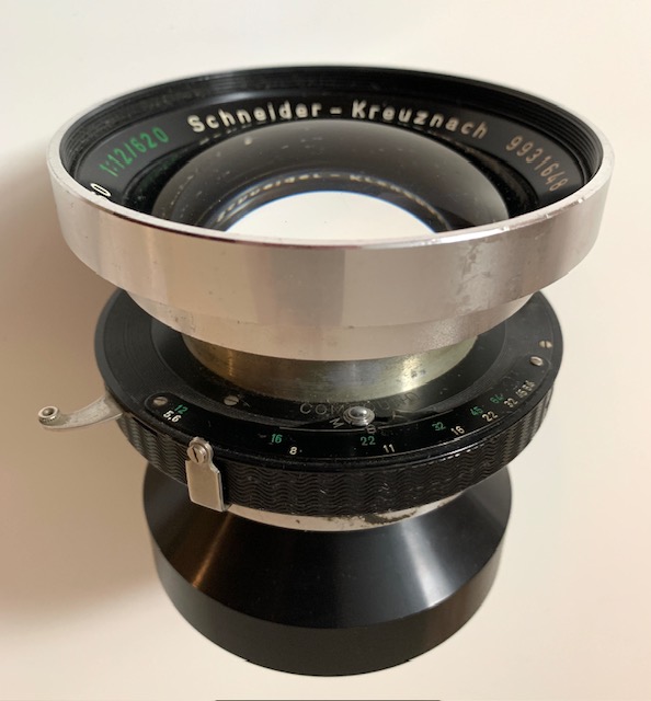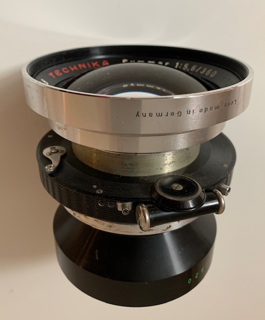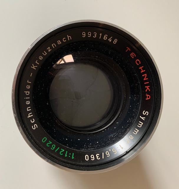 Selling my good condition Symmar 360/620mm f5.6/F12 convertible Technika branded lens. Glass is coated and in good condition with some cleaning wisps and the usual dust specks. Lens is mounted in a Compound 5 shutter with speeds from 1/75 to 1 second and T and B. Shutter fires on all speeds and to my eye and ear appear correct. Shutter is flash synchronised and fires my flash gun correctly. Cable release socket works correctly and lens comes with retaining ring that screws in about 1/8 inch but holds lens firmly. This lens reputed to cover 12x20 and it certainly covers my 10X12 camera. Selling because it is just a bit too heavy for me at my advanced age!