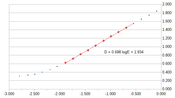 Rounding up by 0.002, the gamma results as 0.70. Not 0.56. And identifying the straight-line portion is not problematic, as one can see at a glance from the near-perfect agreement between the fit line and the red crosses.