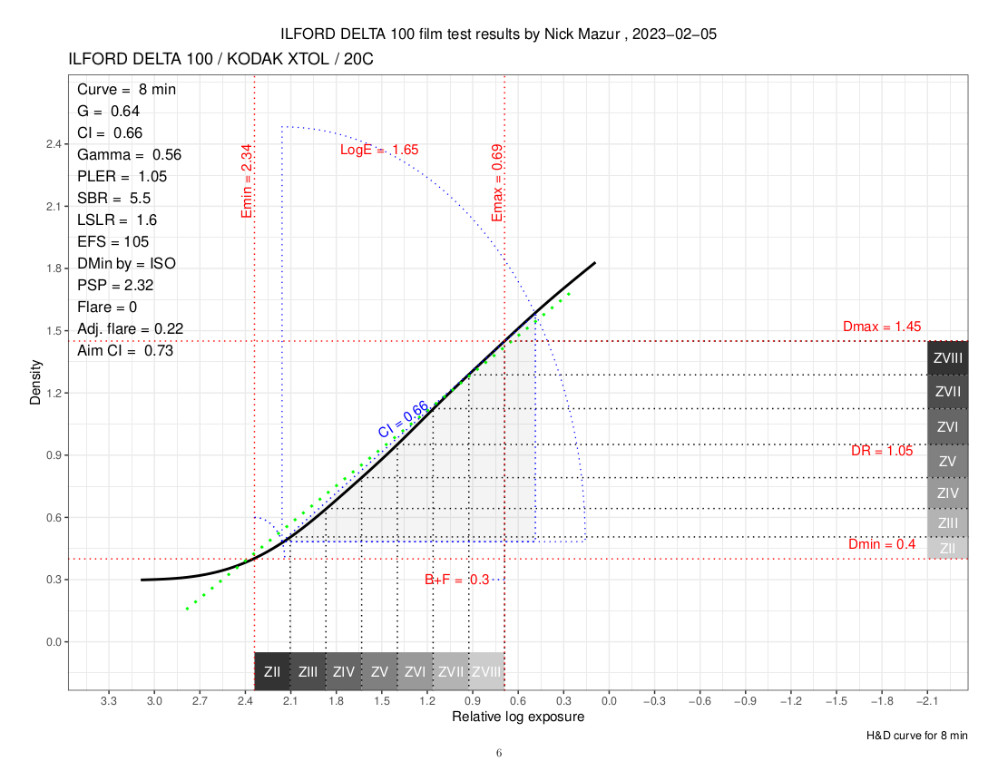Here's a more detailed plot of that eight-minute curve you mentioned. It shows the Contrast Index calculation (in dotted blue lines) and Gamma (dashed green line). The green line does not coincide with the line you identified, but, as far as the algorithm is concerned, this line represents the "straight-line" portion of the curve. Which one is more correct? That depends on the point of view, unfortunately. I wish this was a simple thing. This is why, I almost always use the CI to estimate contrast. It's just a lot more unambiguous.