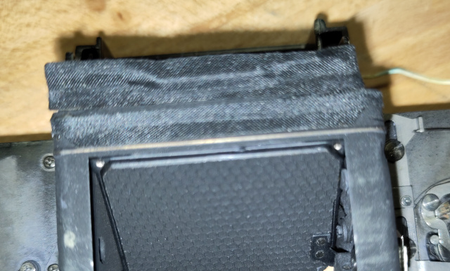 The other issue is not about light seal foam, but a piece of adhesive cloth that sits at the back of the mirror box and isolates (I think) the CdS cell from the finder. There is a similar material at the bottom of the mirror cage, it shields a lever.