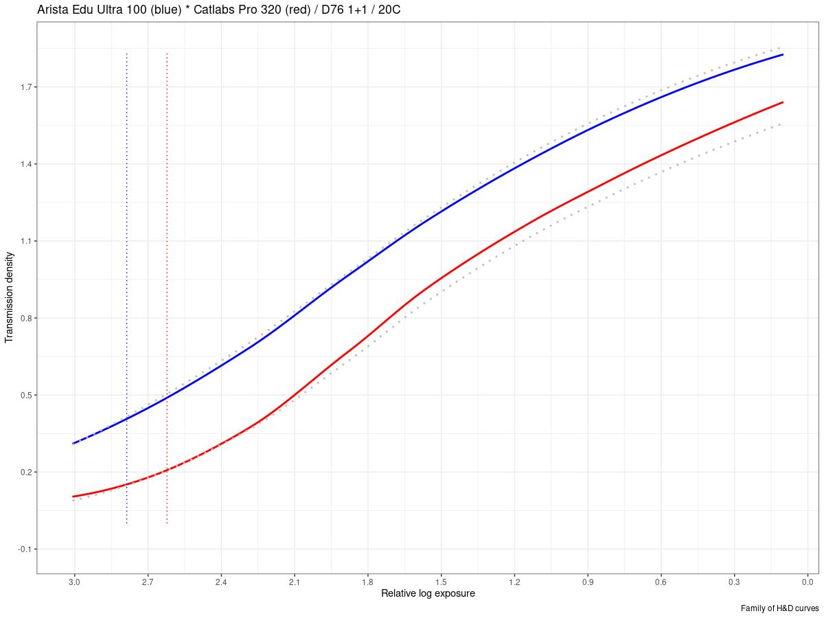 And, yes, you are correct, the Catlabs Pro 320 does, indeed appear slower than the Arista Edu Ultra 100 by about 1/2 stop.