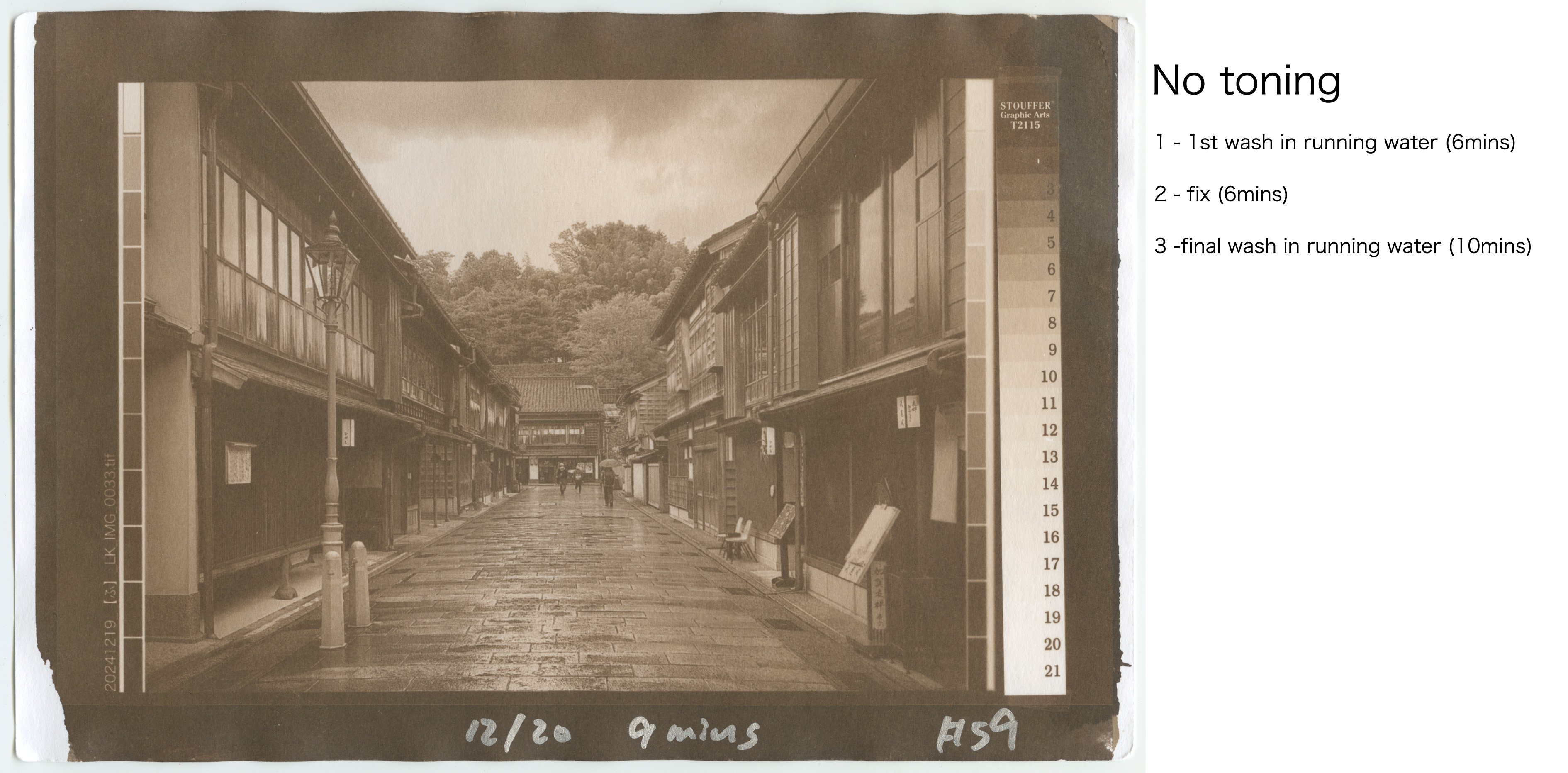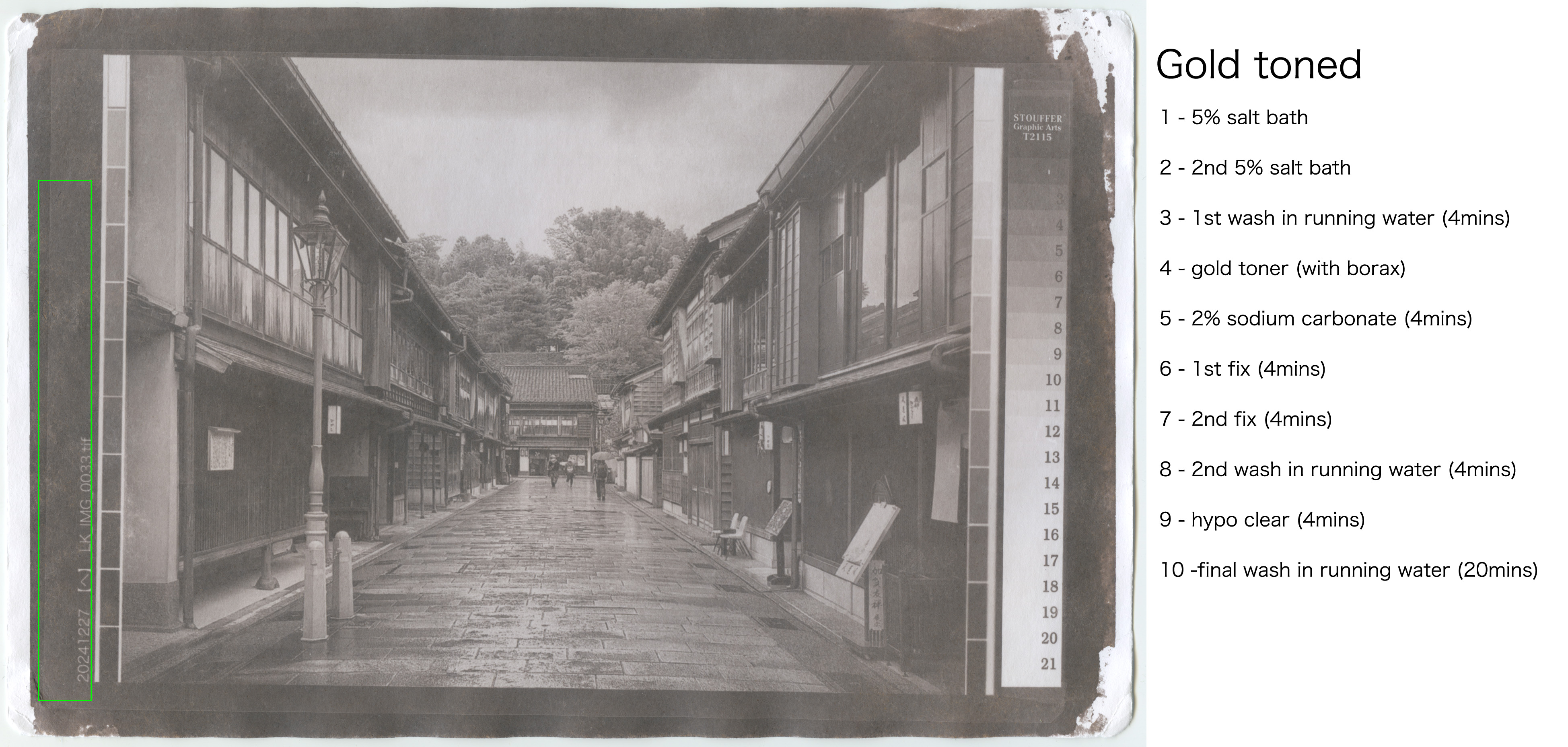 Furthermore, when I attempted Gold toning on the prints made with this method, expecting the blacks to deepen slightly, the result was that the Dmax actually became shallower compared to the untoned print—quite an unexpected outcome :sad: