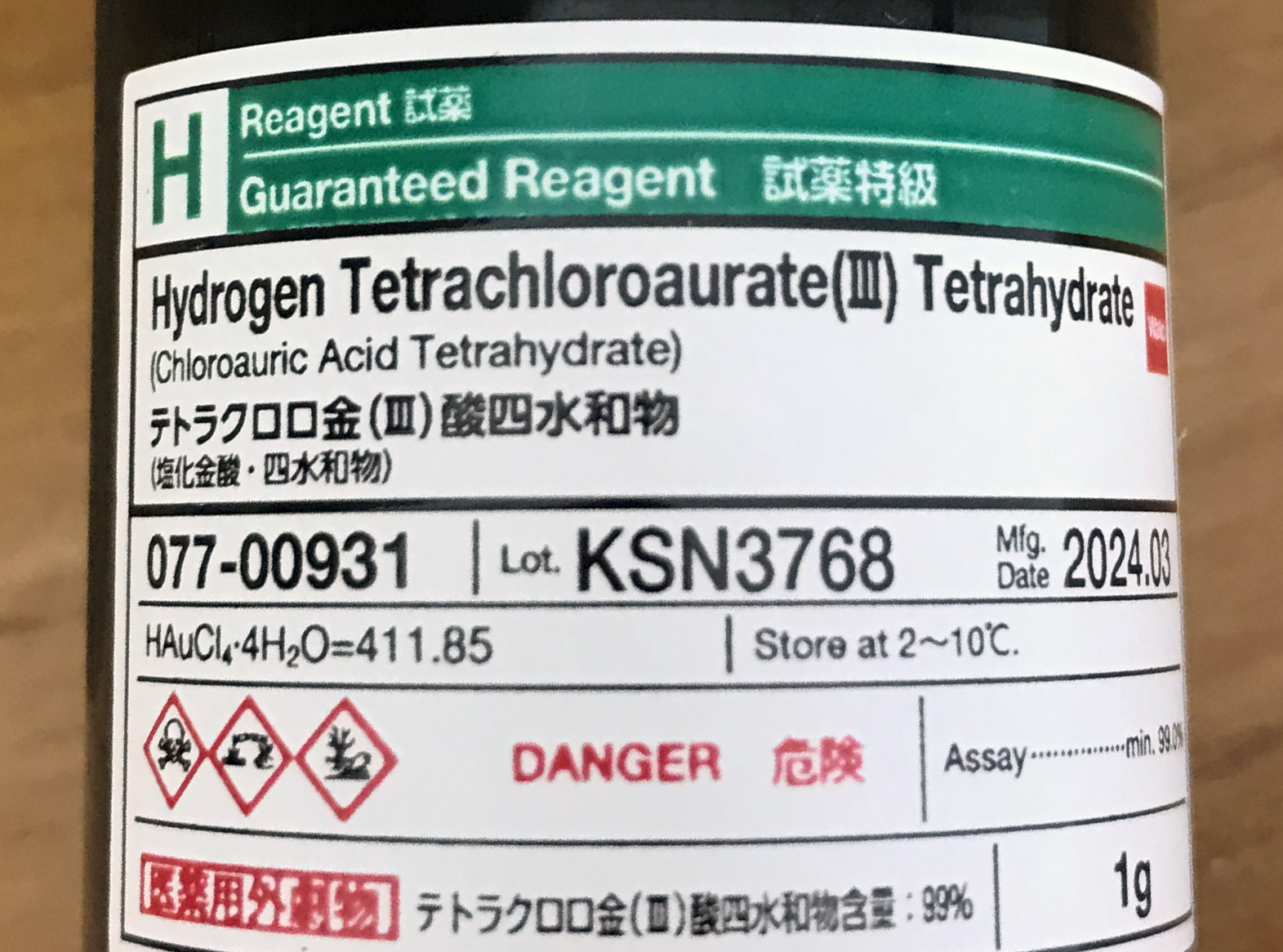 I obtained 1 gram of powdered Gold Chloride here (picture) in Tokyo, and I intend to dissolve it in 100 ml of water to create a Gold Chloride stock solution.