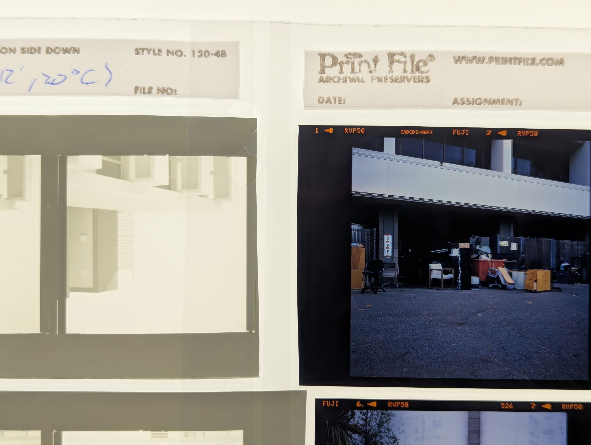 A very casual inspection suggests that the film speed may have been ISO 0.4, and I am intrigued enough to do a more thorough density curve for my process. Before I do, I wanted to check a detail. On the left is 2422 (developed by me) while on the right is some Velvia 50 developed by a lab, and I see a huge difference in the opacity of the unexposed area. Is this inherent of B/W transparency or is this caused by my process*?