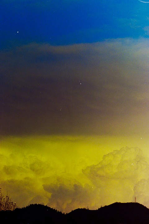 strips of color , the deep saturated blue of the clean sky on top, the dark grey still cloudy in the middle and the yellow of the sunset in the lower strip.