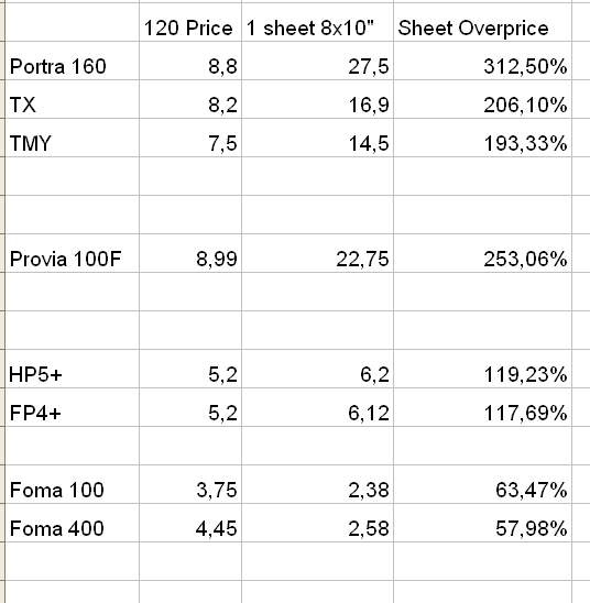 Also, see attached PDF and bellow with extensive US price information I collected some time ago (2017), exactly same pattern. One thing changed if 2017 ilford was selling shets a bit cheaper that rolls, today they have a 120% price in the EU, compared to rolls: