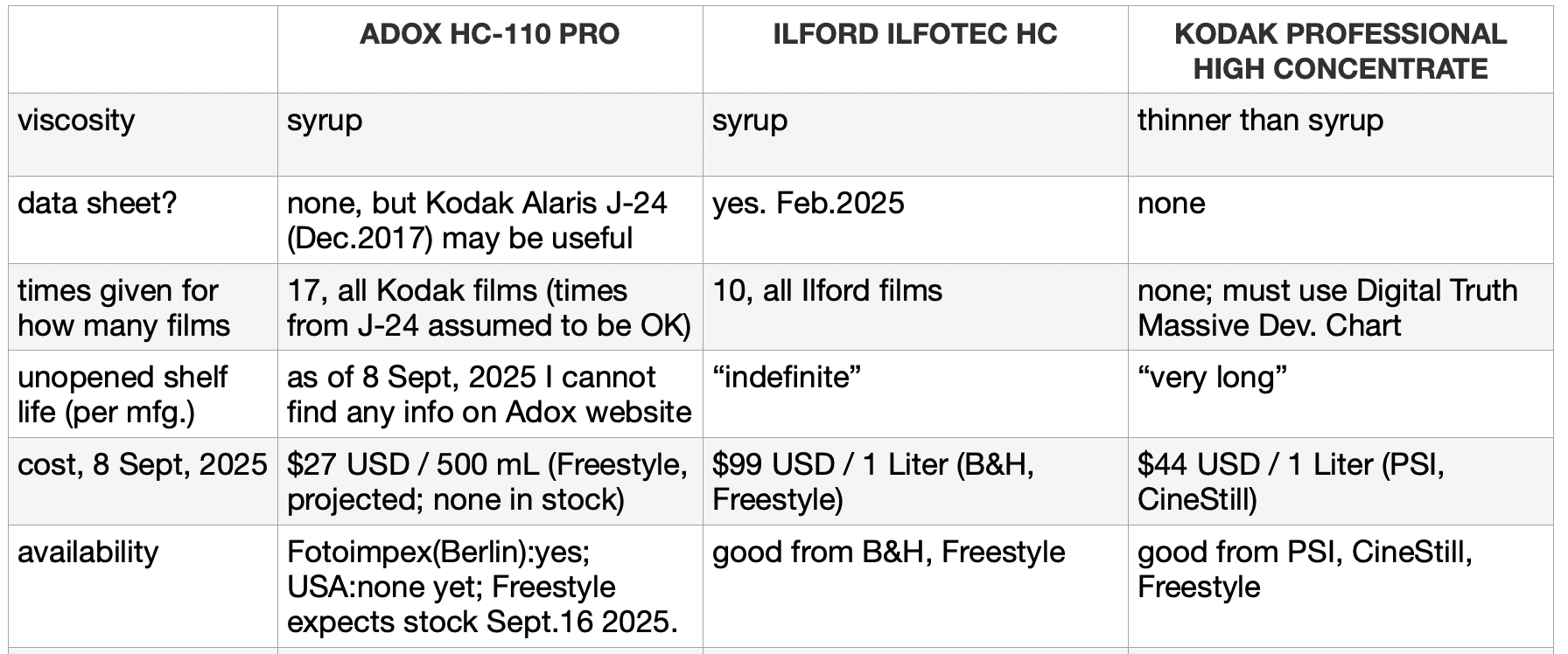 I made this little table comparing three of the HC-110 varients. I know there are others, but these are the three I would be considering. BTW I think B&H might still have some of the syrupy Kodak HC-110 from 2019 available? But my table includes only the current, thinner version from PSI (Photo Systems, Inc).