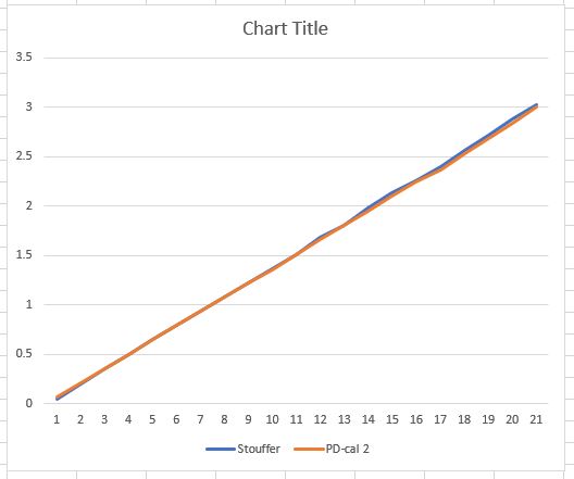 Yes I understand why the lines begin to diverge due to greater deviations in readings with increasing density......but my question is......if the PD measurements are within Stouffer's stated tolerances on the much more dense half of the wedge.......is there an actual "error" that needs addressing in the calibration of the PD? Perhaps I'm asking an invalid question.
