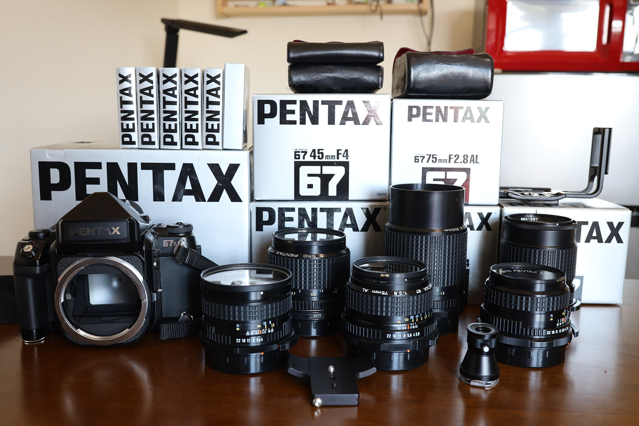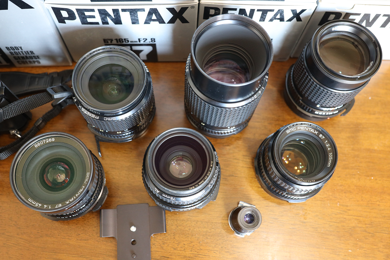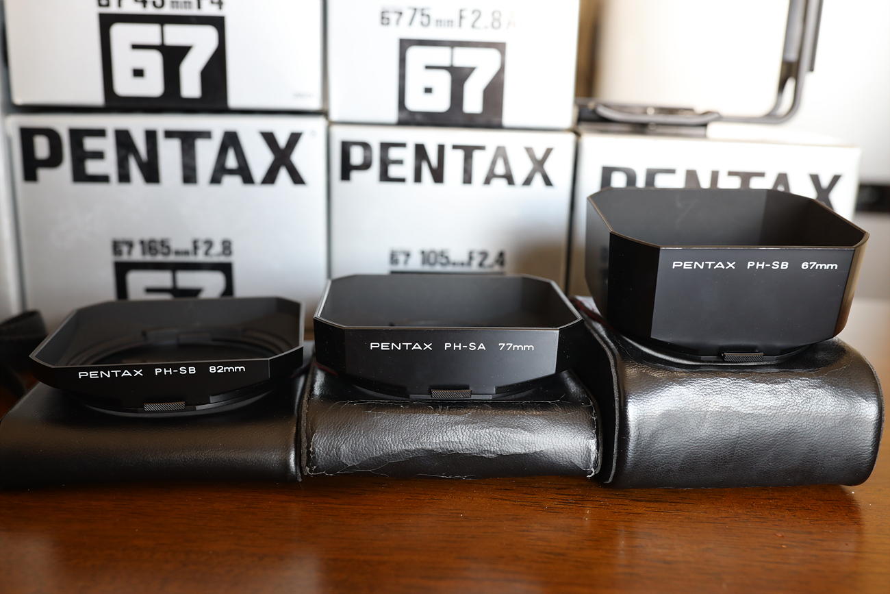 Includes: original boxes for the body and AE finder, top cap for the camera body, bottom cap for the AE finder, original Pentax strap with lugs. I should have the body cap somewhere. Currently have the eyecup installed but still have the original round rubber piece.