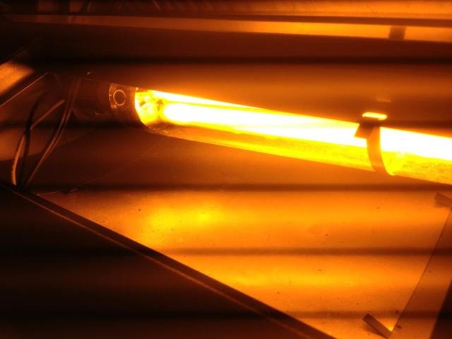 It's these not-visible-to-the-eye blue and green spikes that are the source of the Duplex's reputation for fogging paper, not its overall brightness. See here for an example of the output spectra from an LPS tube. (Fourth example down the page.) Note the much dimmer blue and green bands to the left of the predominant yellow. There is also a red band to the right, but that of course does no harm.
