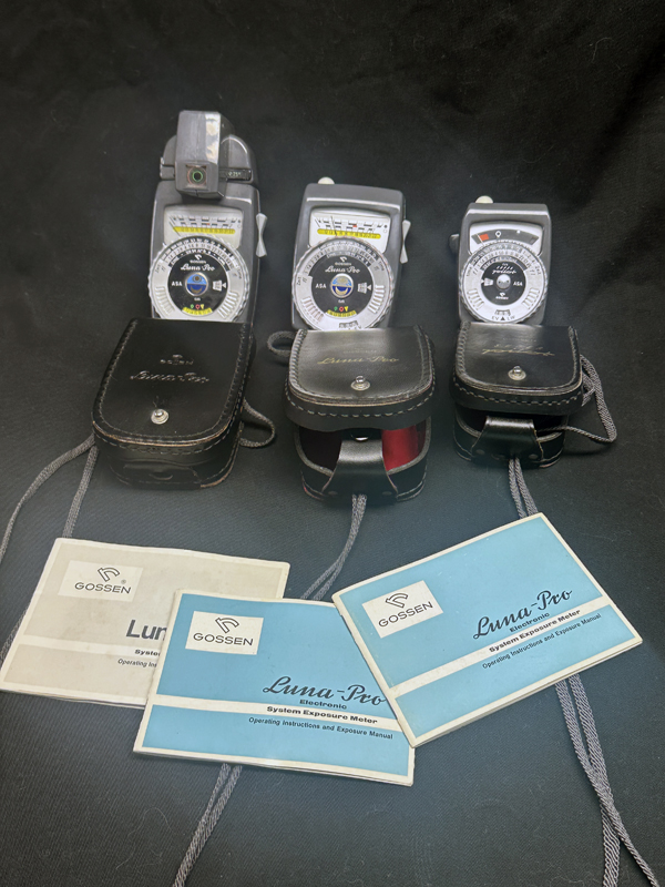 I have three functioning Gossen Light meters that could use a new home. Two are Luna Pros (one with the spot meter attachment) and one Super Pilot. All have their cases and are working. No guarantee on accuracy. Asking $65 which includes shipping in the COUNS. I accept PayPal.