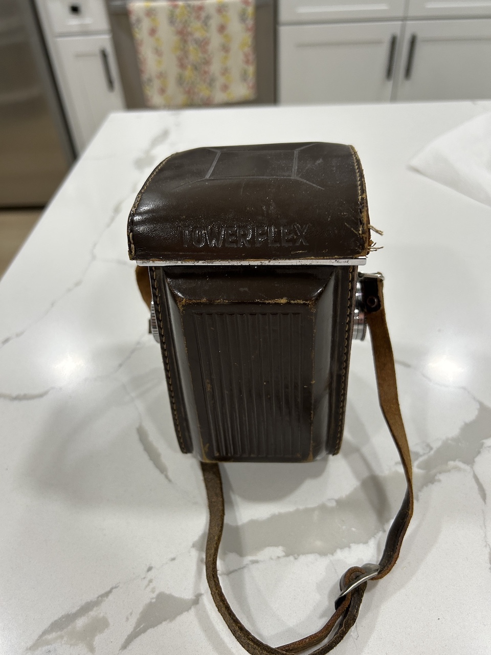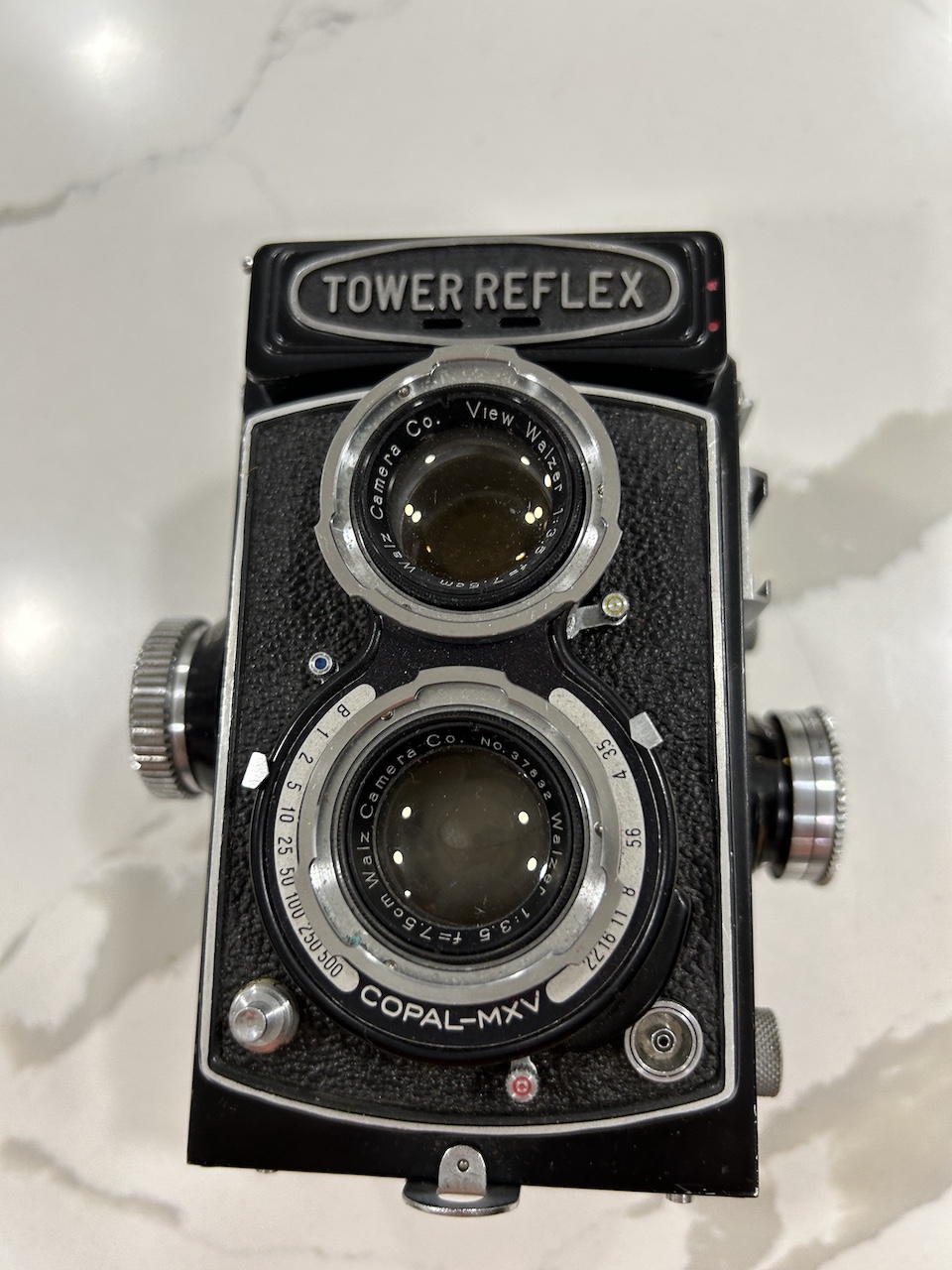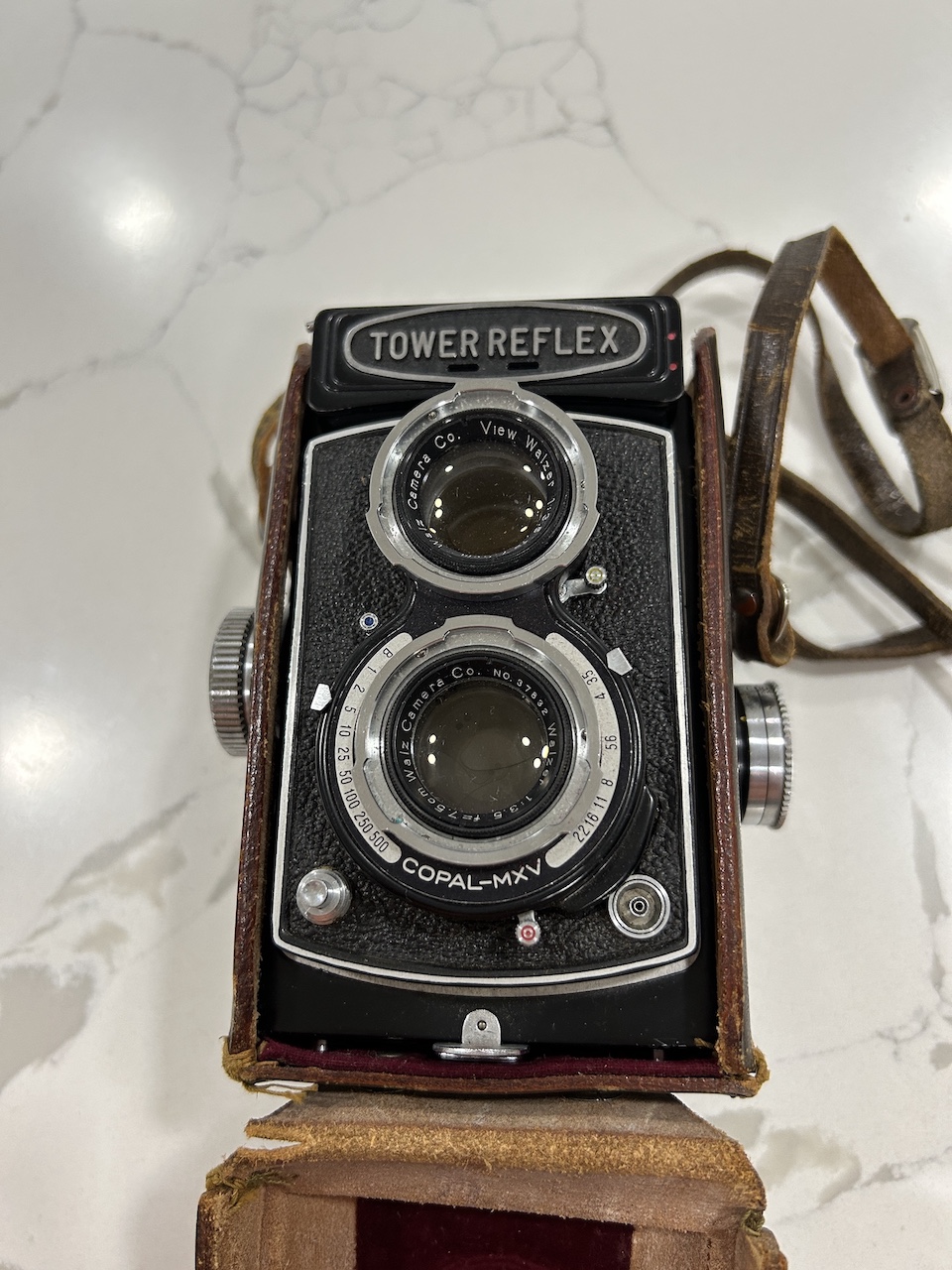 I am selling my Tower Reflex TLR. This is sort of a Japanese copy of later era Rolleicord's. There were several Tower TLR's, and I believe this one specifically is the Tower Model 65 which sold by Sears. The taking lens is very clean and clear, with damage-free glass. The meter does not work. The shutter fires properly at all speeds except 1 sec might be closer to 1.5 or 2 sec. The flash sync works great. The meter is not working (who needs it?). The viewing screen is pretty dim, but I've been able to live with that. The case is well used, but fully functional.