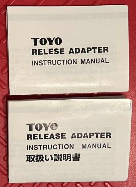This type of adapter is used with wide-angle lenses mounted on recessed lens boards, where it can be otherwise difficult to attach a cable release. This one is new-in-the-box, still sealed in its little plastic bag, and includes two instruction sheets, one in English and one in Japanese. I only opened the box to take a few photos but didn't break the seal on the plastic bag. The box has a little shelf wear. B+H has a nice product picture here: https://www.bhphotovideo.com/c/prod...iew_180_642_Angled_Cable_Release_Adapter.html