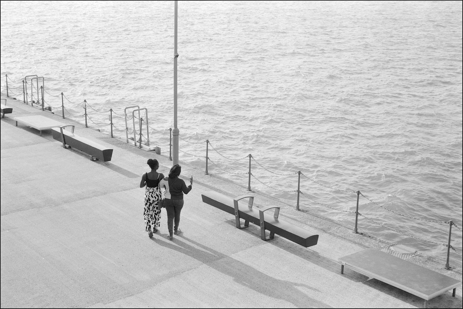 I thought of this thread when scanning the film I developed today, and thought I'd share how my thoughts went. I quite liked the shot attached here, but after a little while I noticed how the lamp-post is right behind the head of one of these ladies. Then I thought: I had time - maybe 10 or 15 sec - to choose how to frame the shot and when to press the button. So what I've got is the moment when instinctively I felt everything was as right as it was going to be. Naturally, after the event, one can search for compositional 'rules' that are upheld or broken. So I find - with some surprise and a sense of seeing afresh - that there are two diagonals: one explicitly marked by the railings and paralleled by the shadows, one implicit from BL corner to TR corner. The ladies are oriented towards the intersection of those diagonals, marked by the lamp-post. X marks the spot. If there is a rule about lamp-posts growing out of people's heads, I've definitely transgressed; but I think there's enough tonal contrast to minimise any visual ambiguity. And finally, who cares? It was a lovely walk, late on a sunny afternoon, and I like this reminder of it. I'm not expecting a knock on the door from the Rules Police. They have Bigger Fish to fry.