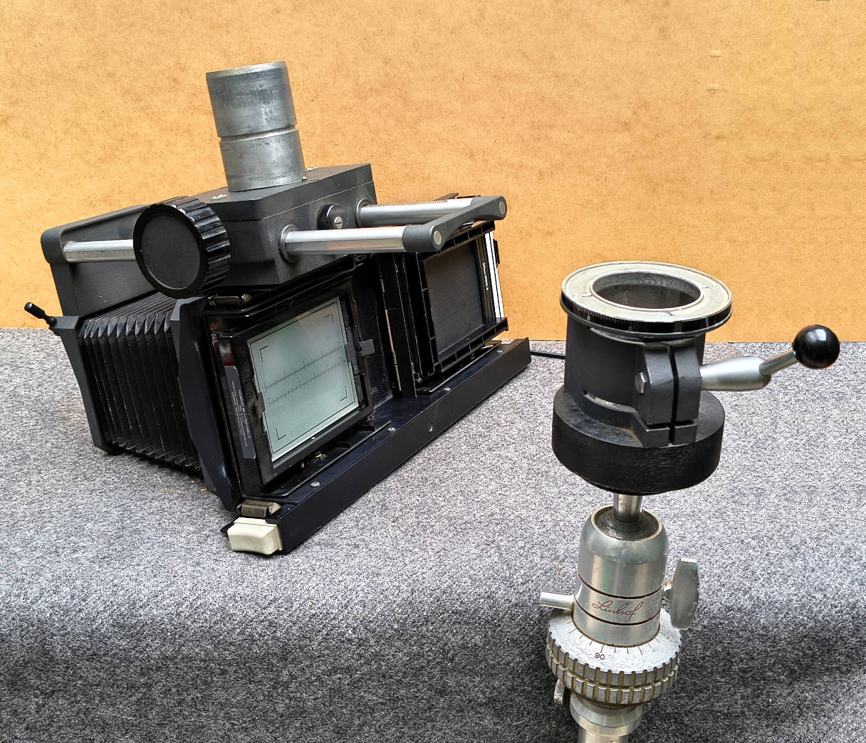 Also a late version, Bogen/Manfrotto head 3047 head which weighs almost 4 pounds, making it suitable for use with an 8 x 10, something I have practically no likelihood of ever doing. I didn’t realize the late versions were that much heavier than the one I had way back when I got my first zone six field camera so I’m looking for a pan/tilt head compatible with the above. I don’t need to turn the camera on its side like I might with a DSLR so I think a two way will work with the leveling base.