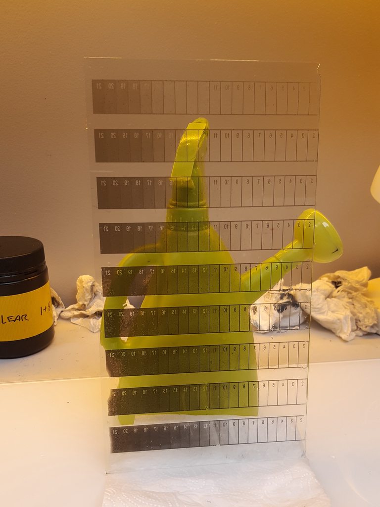 Nevertheless I tried doing an exposure test, from 6 to 60 seconds, and to my genuine surprise I actually got some really promising results! There's some damage from when I dropped the glass plate into the sink during development, but the PVA layer was actually fine during development, and appears to be well bonded to the glass. There's a bit of base-fog/stain but it's tolerable (a thicker layer with lower pigment loading in the future would reduce this).