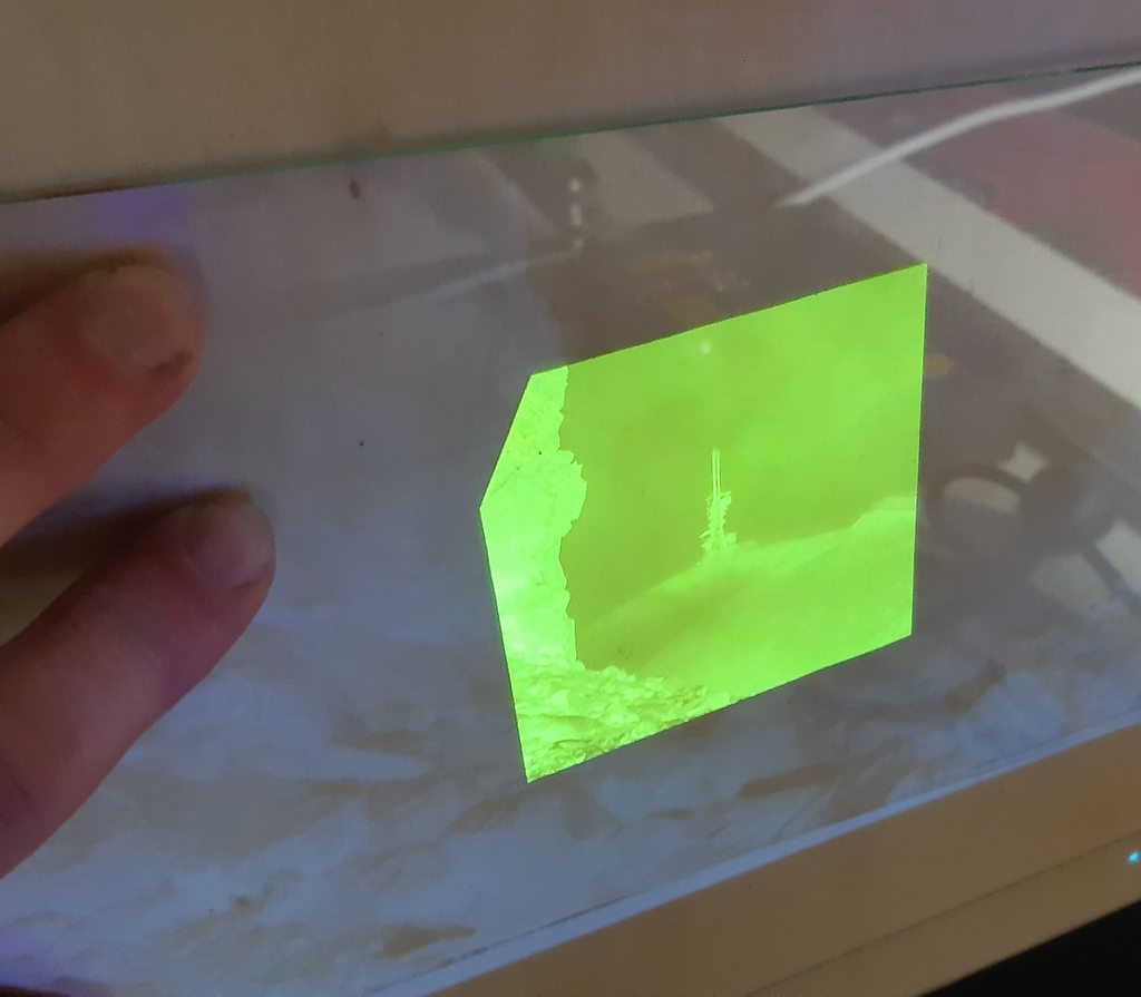 One advantage of using a projector for exposure that you might not think about is the ability to project a sharp image onto the back-surface of a sheet of glass. This isn't possible with contact printing because the thickness of the glass between the negative and the rear surface causes a lot of diffusion, but with a projector it's possible to focus the image onto the rear surface of the glass and then it's perfectly sharp.
