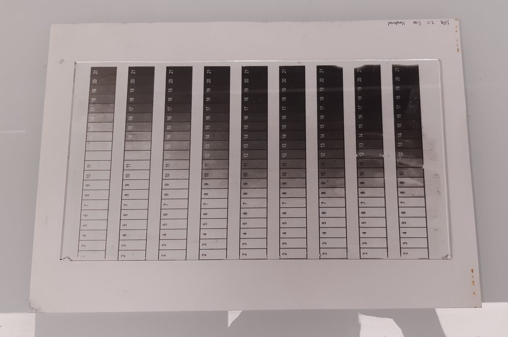Here's a plain photo of the 6 different layers, each with 21-step scale exposed at the correct time for that layer. They look very light in this photo, but they get significantly darker when stacked on top of each other.