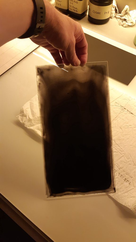 To test this, I coated a piece of glass with some 2% colour-paste PVA-SbQ (dilute 1+8 with water). I initially tried brushing but to get a thick enough coat to be opaque I had to pour the emulsion on and spread it around more like coating a wet plate.