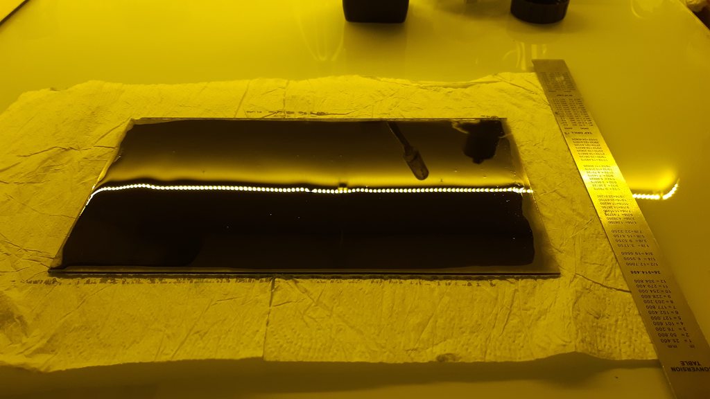 I tried drying the plate using a fan heater, but the table it was sitting on was not level and the heater dried it unevenly, resulting in a significant variation in emulsion thickness across the plate. I think next time I'm going to try making a much more concentrated PVA mixture as a more viscous layer should be more even.