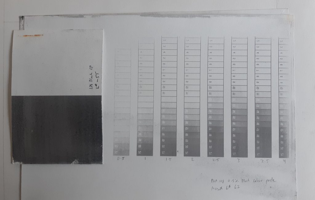 • Using Calvin's black colour paste in my emulsion rather than india ink or dry lampblack pigment
