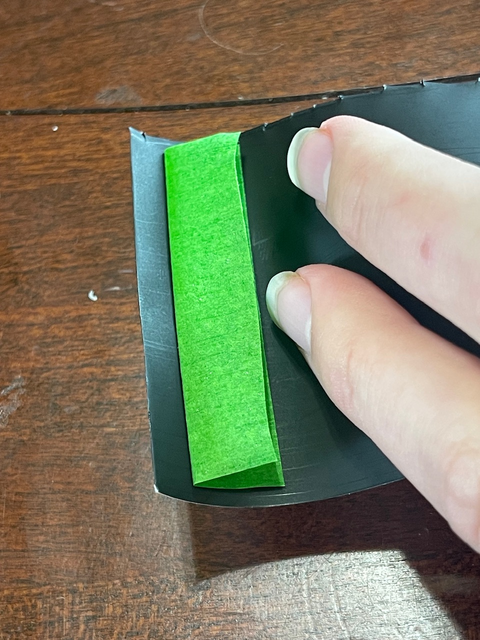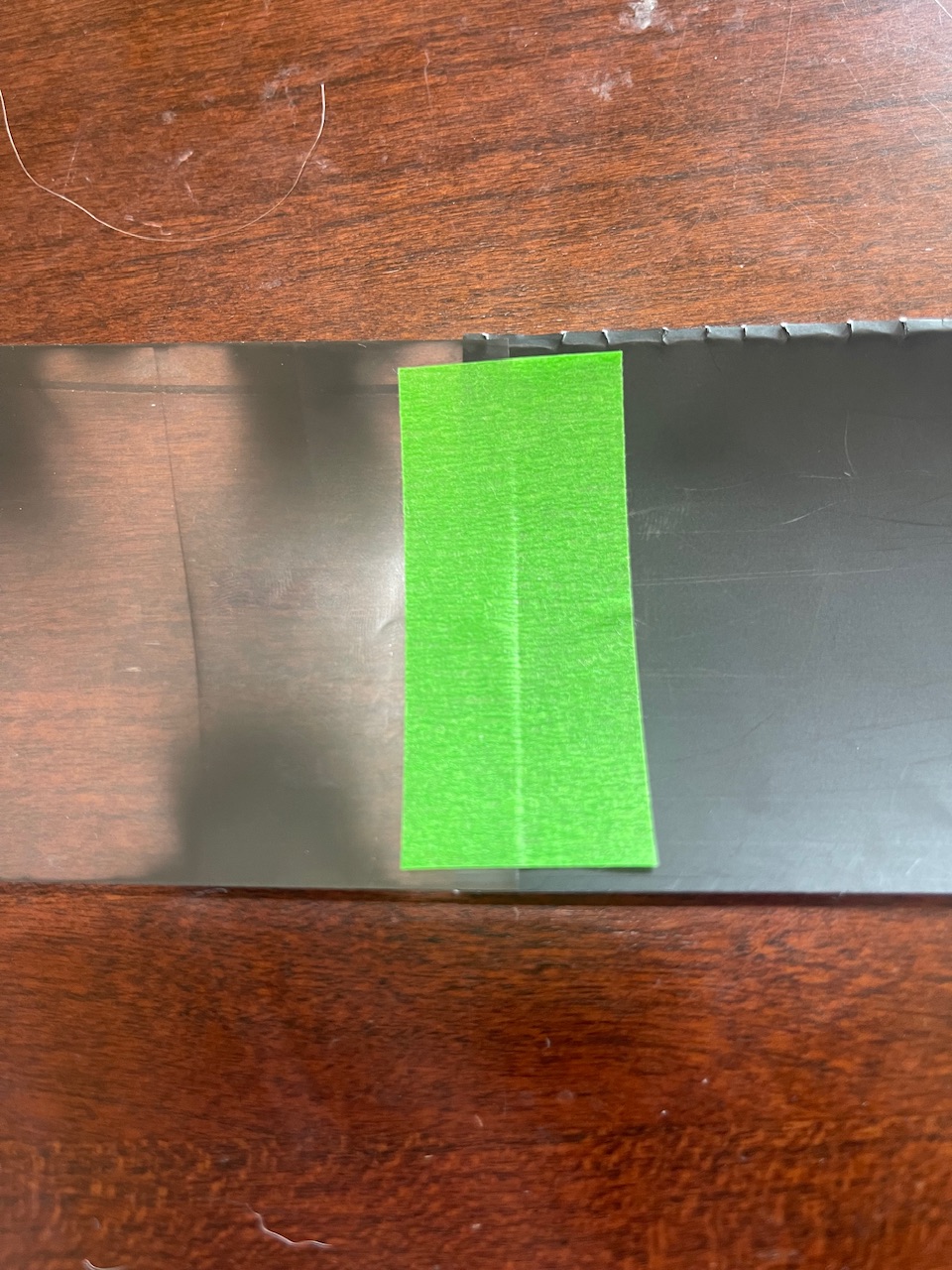 Now, add the tape to the back of the paper. I use masking tape, as it is very similar to what most manufacturers use. It is approximately 2.25 in (55mm) long, and 3/4 in (20mm) wide. The tape is folded over along the crease you made to allow the film to be easily attached to the tape in the dark. Try to make sure sure that the tape will not cover more than 0.75 in (20mm), as it may impinge on the first frame past that.