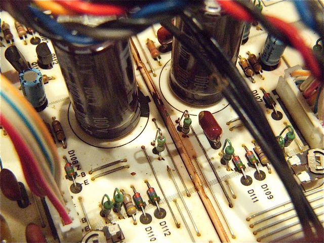 This reminded me of what happend to my Yamaha M-45 Power Amplifier. There is a common fault with the glue used to hold the capacitors in place. The deteriorating glue damages the components. In this case a resistor went open circuit.