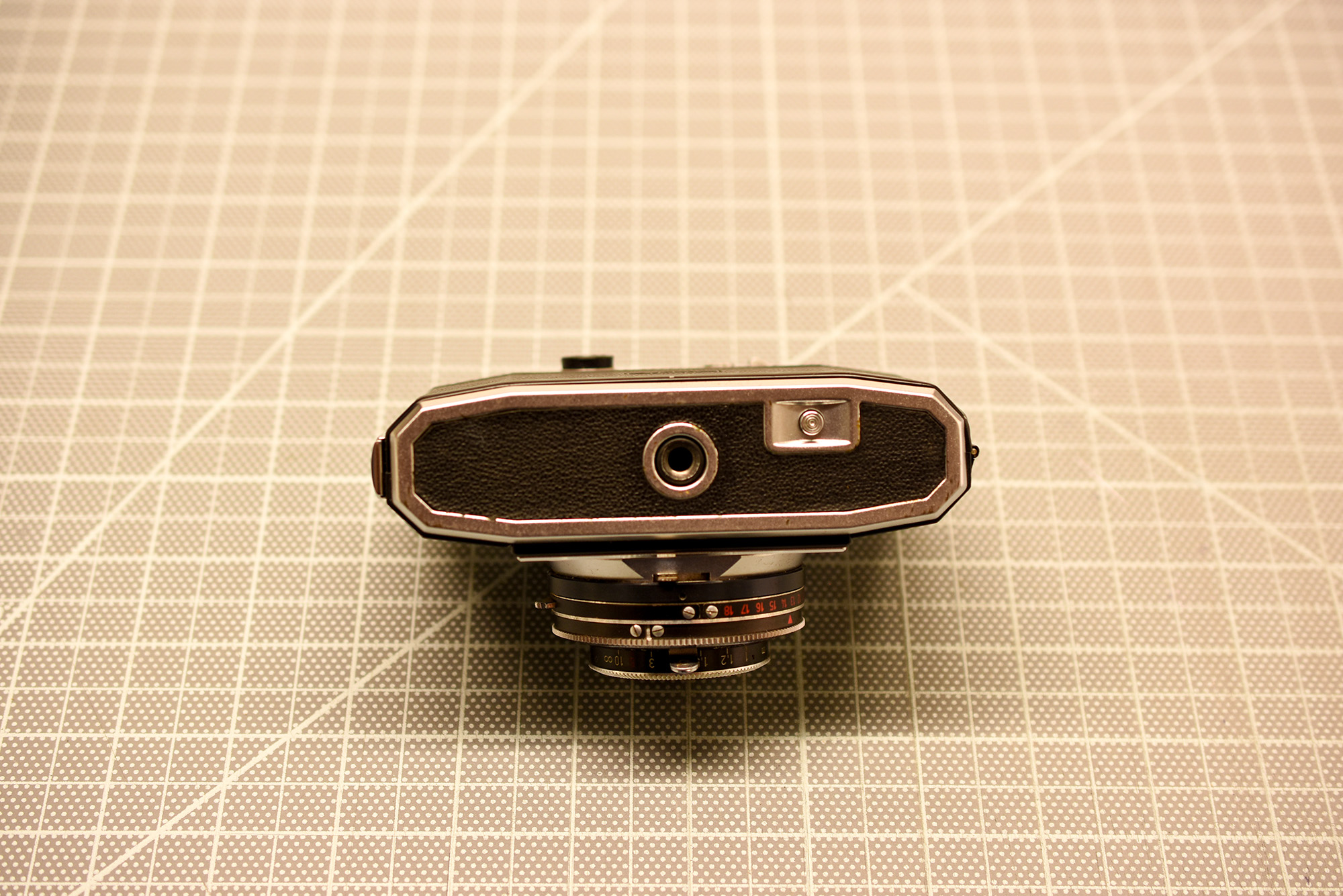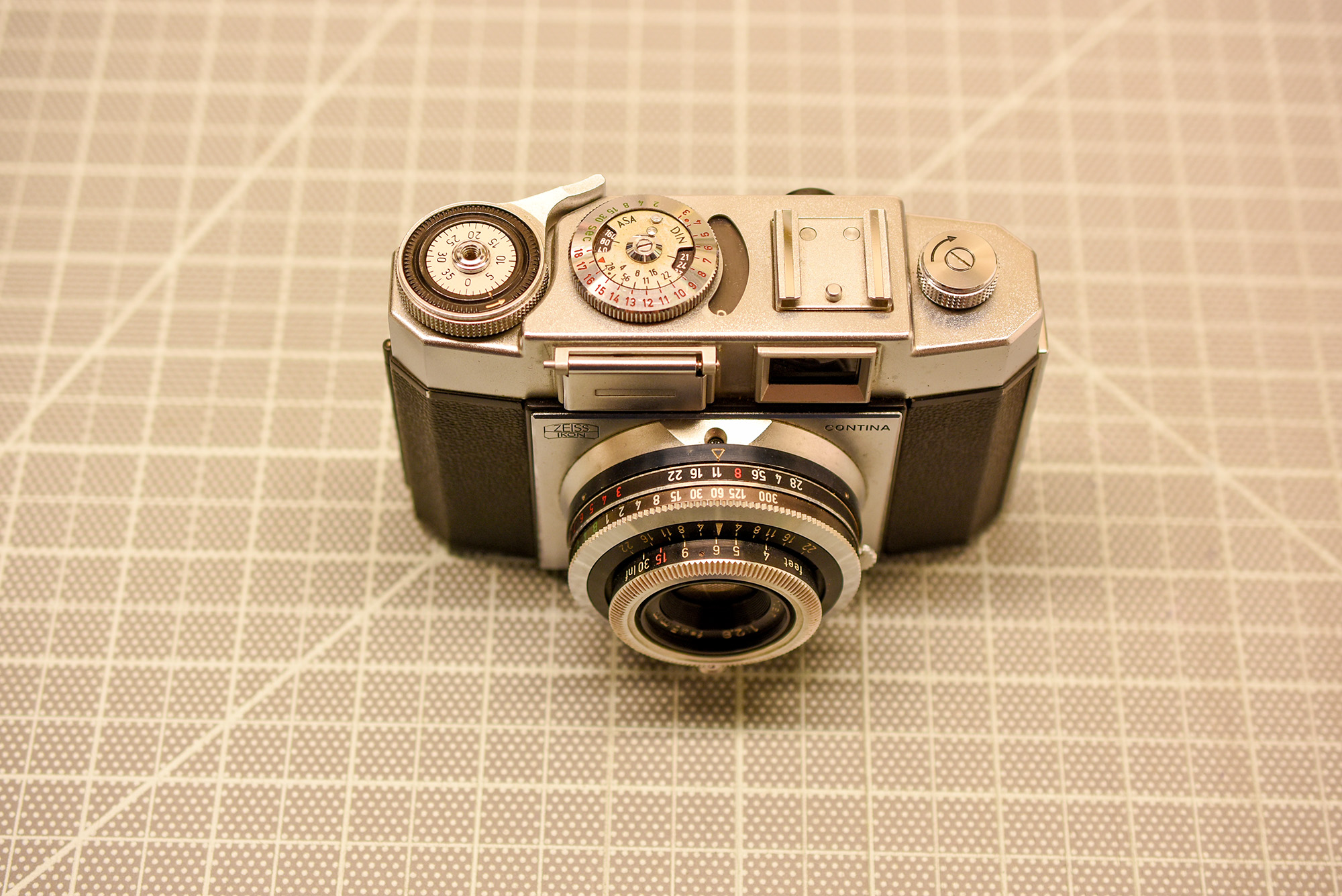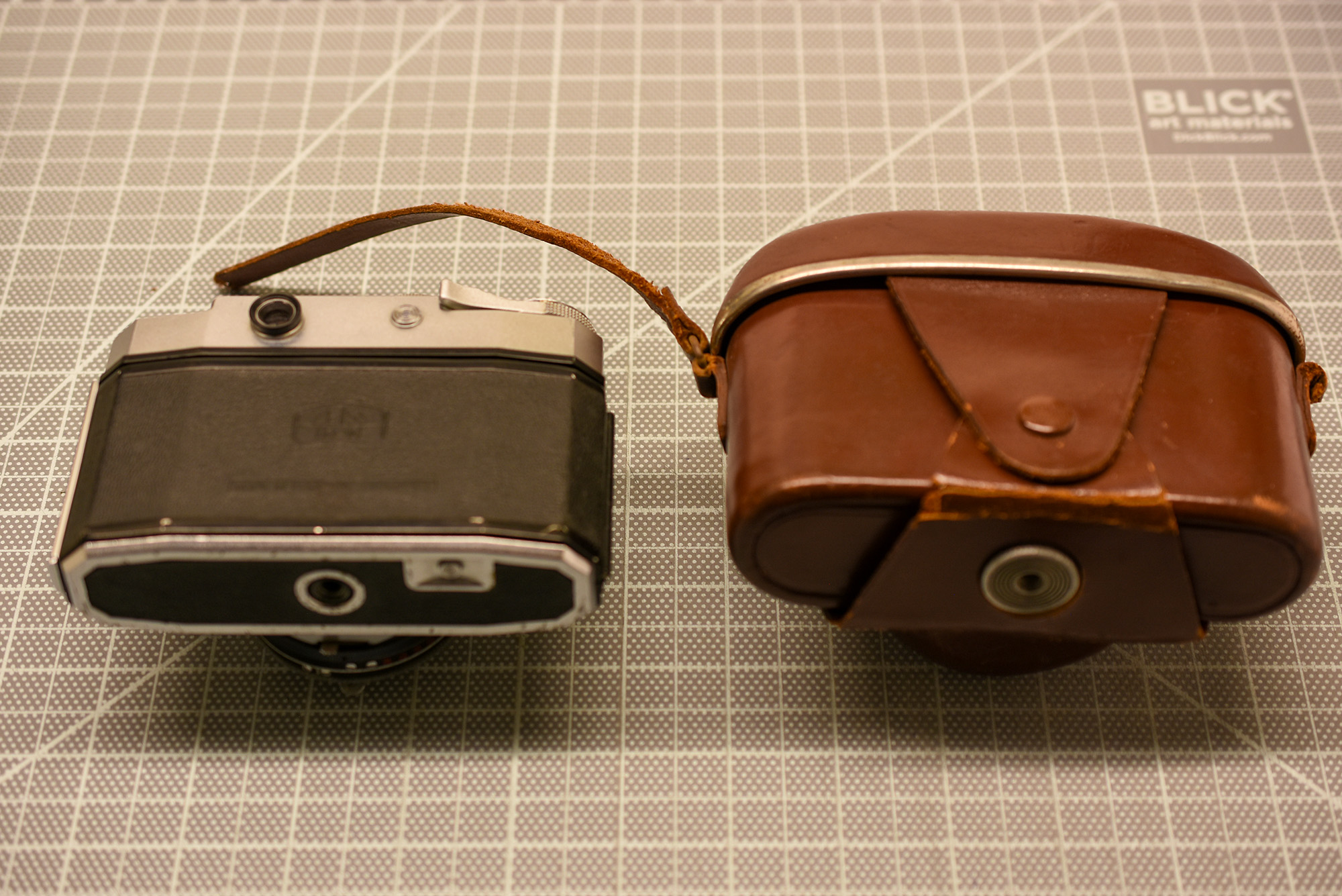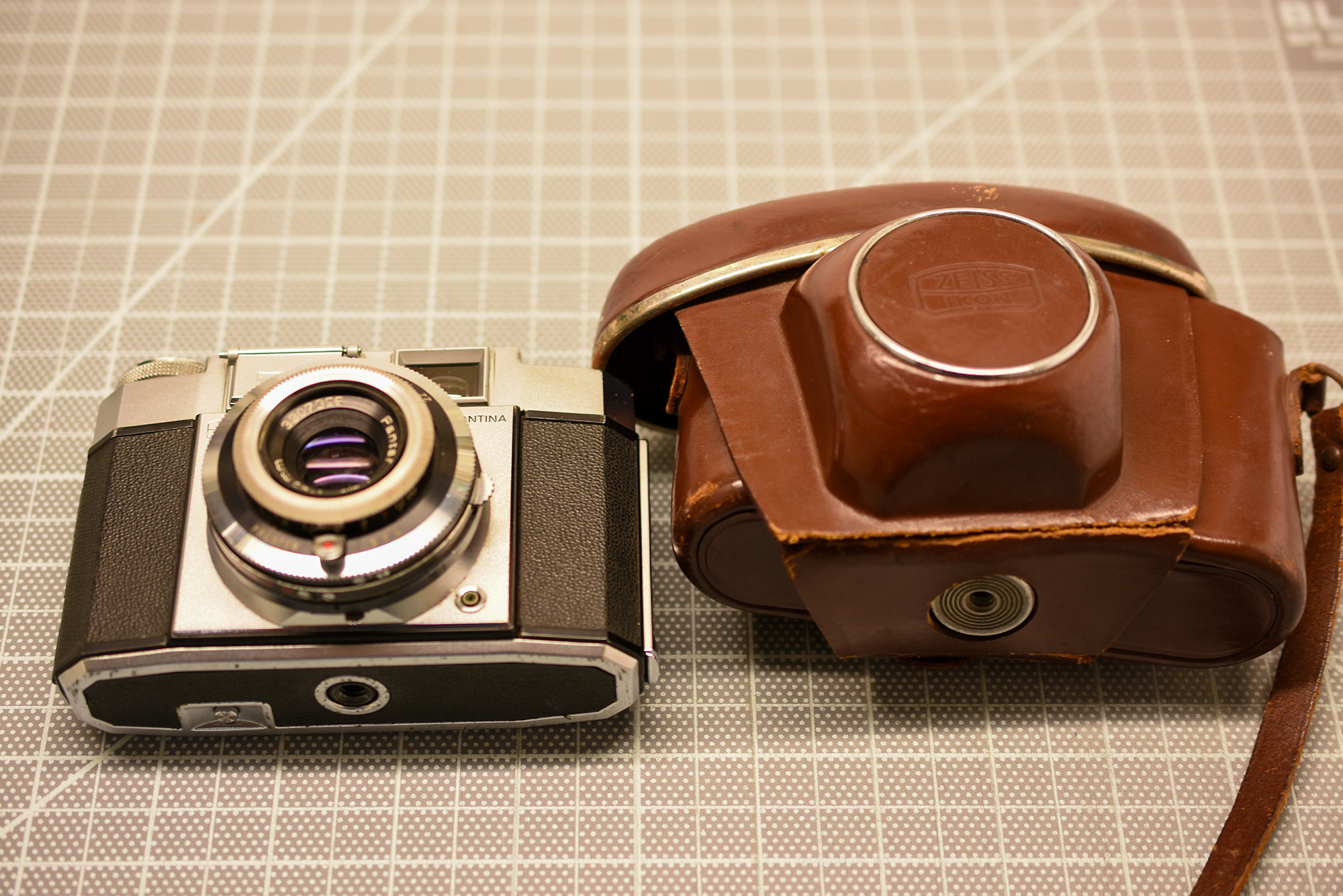 Zeiss Ikon Contina – viewfinder camera. 45 mm f2.8 Plantar lens, leaf shutter. Single stroke film advance. Back opens from the left. Front element of the lens comes out: replaceable with other focal lengths? Selenium matchneedle meter appears to work: needle moves when lighting changes and when shutter speed/aperture changes. Controls a little tight but workable. Film spacing issues? Cosmetically very good and camera is functional. Controls a little tight but workable. Cosmetically decent case, but strap is broken and lug is broken off on one side.Negative scans included.