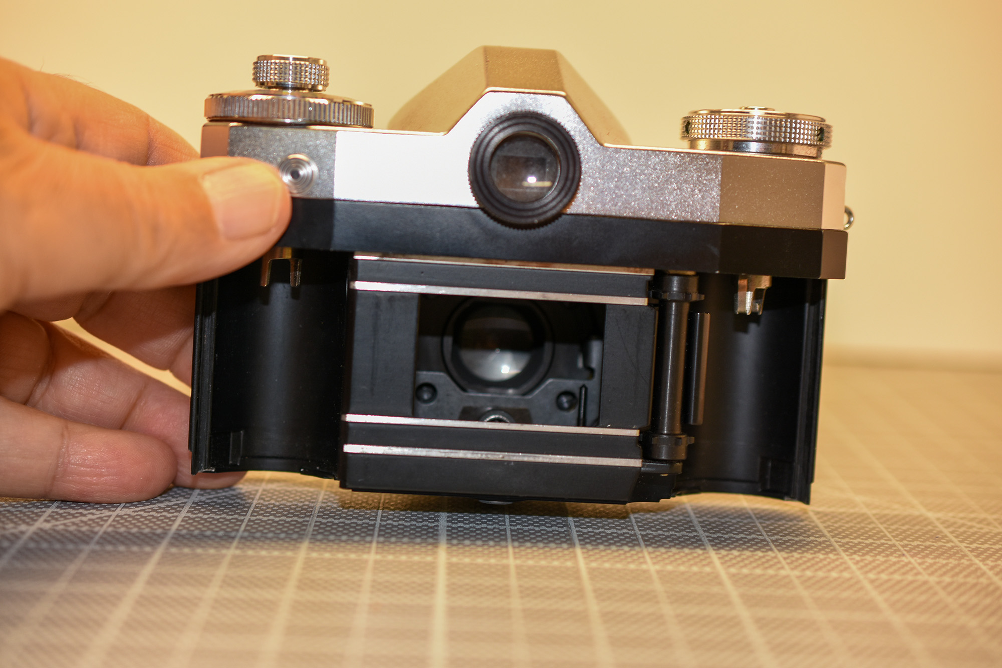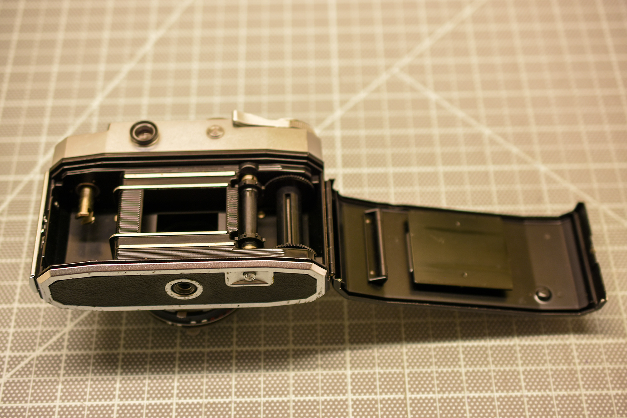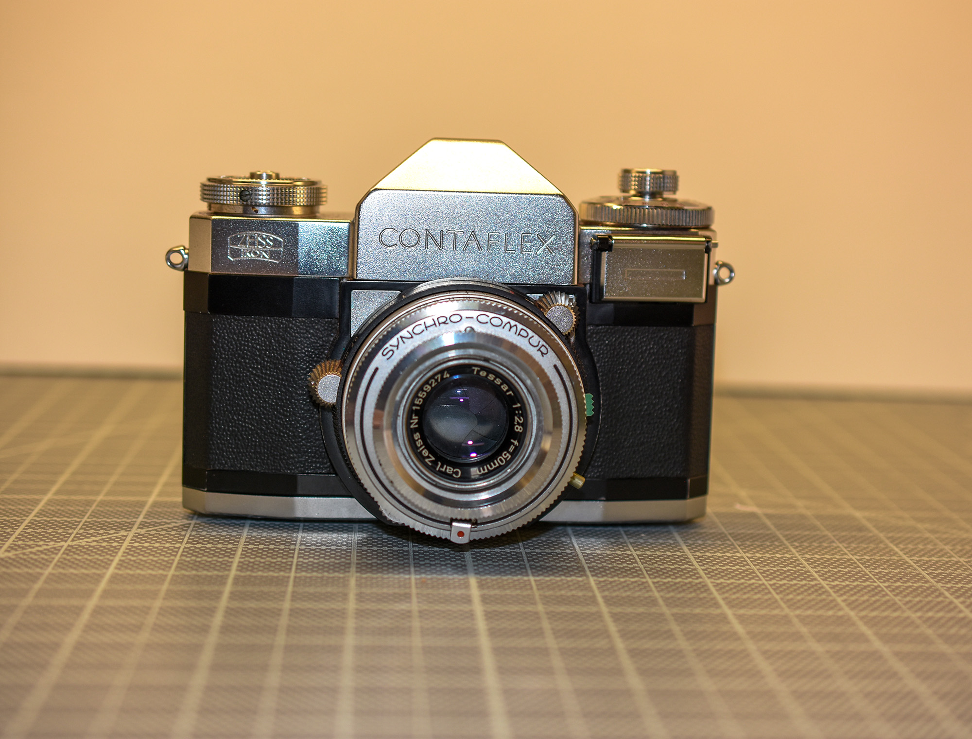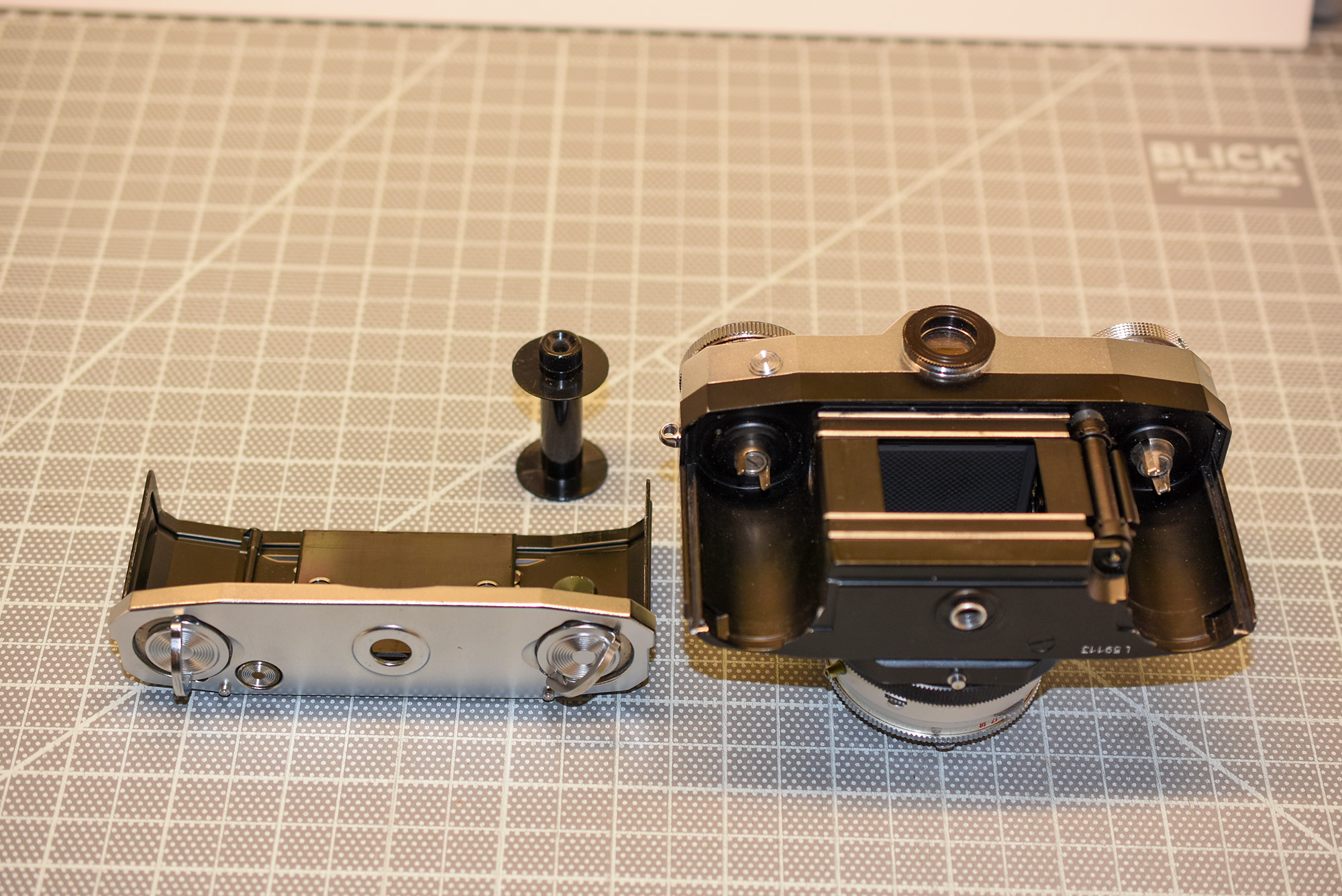Zeiss Ikon Contaflex – world’s first SLR? Non interchangeable 50 mm f2.8 Tessar leaf shutter. Knob wind film advance. After exposure, viewfinder goes dark, mirror returns when film is advanced. Two-lock, drop down back, takeup spool comes out. Selenium matchneedle meter appears to work: needle moves when lighting changes and when shutter speed/aperture changes. Cosmetically very good, and camera is functional. Heavy! Controls a little tight but workable. Cosmetically decent case. Negative scans included.