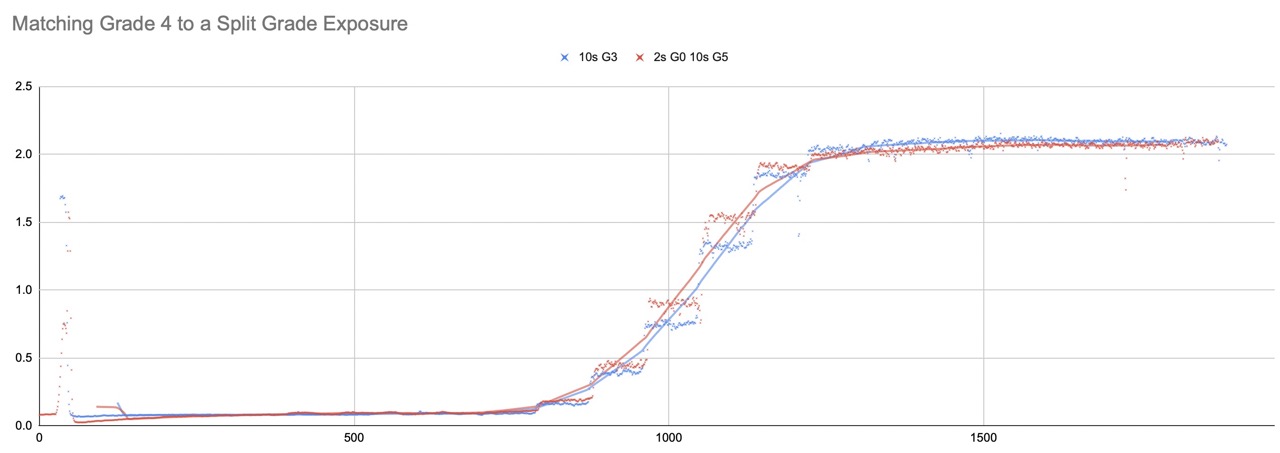 This discussion inspired me to do a bit of a study on split grades using a step wedge and some excel kung-fu
