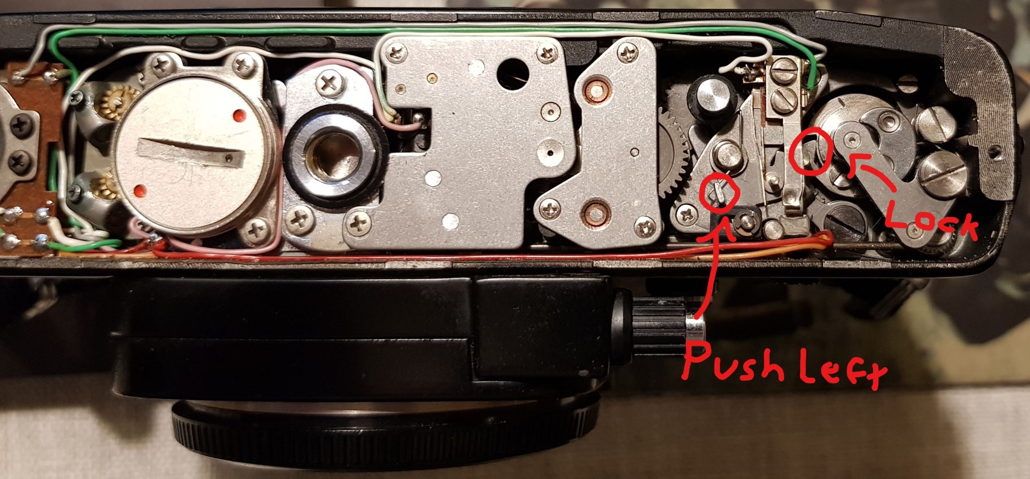 Pic 1 - the base plate of the camera removed. The wind mechanism is on the right, and the lever that needs to be pushed is just underneath the rewind button, which is the silver circle directly underneath the film wind lever.